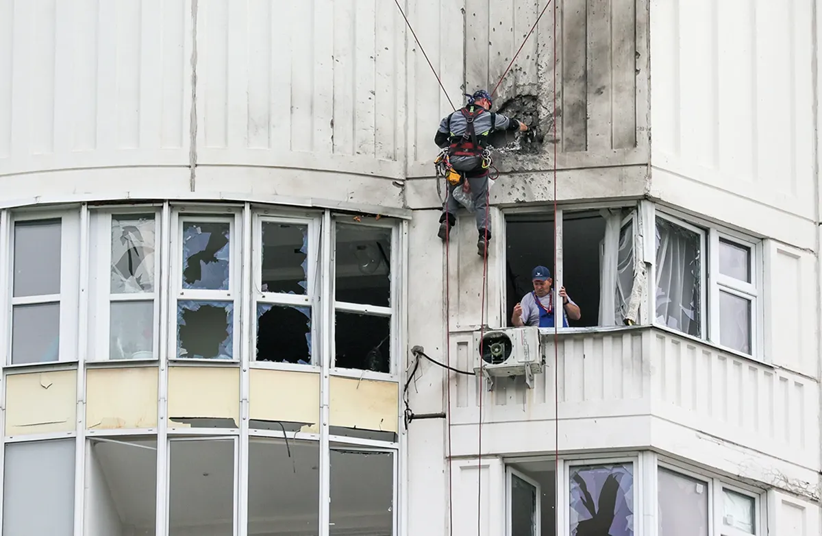 Первые сообщения о беспилотниках, атаковавших Москву, появились около четырех утра. Новая Москва стала первым местом, откуда пришли сообщения. Поселение Московский, улица Атласова: примерно в десяти километрах от съезда с МКАДа беспилотник врезался в окно 25-го этажа многоквартирного дома. В квартире в это время спала семья с пятилетним ребенком. По информации ТАСС, легкое осколочное ранение получила женщина, находившаяся внутри квартиры, больше никто не пострадал. Окна повыбивало еще на двух этажах ниже.