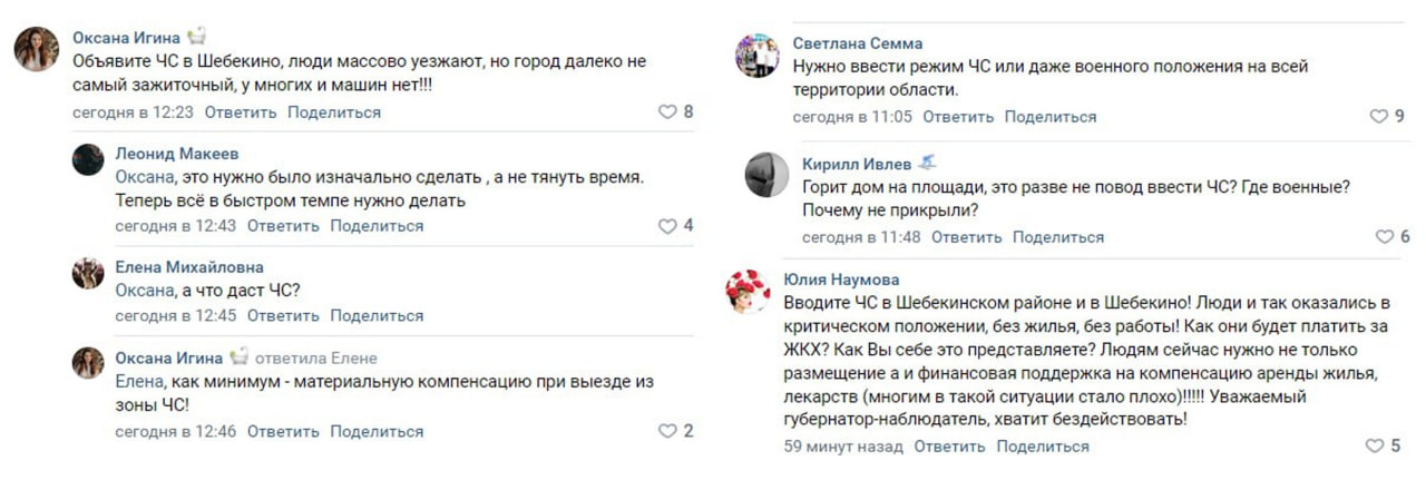 - Вопрос о введении режима ЧС и компенсациях за аренду жилья под последним постом Гладкова на его странице «ВКонтакте» поднимали уже не менее 10 раз. Не на один из них губернатор не ответил, тогда как на другие вопросы отвечает. Лишь глава администрации Шебекинского городского округа Владимир Жданов под одним из комментариев сообщил, что «в настоящее время решения по выплатам не приняты».