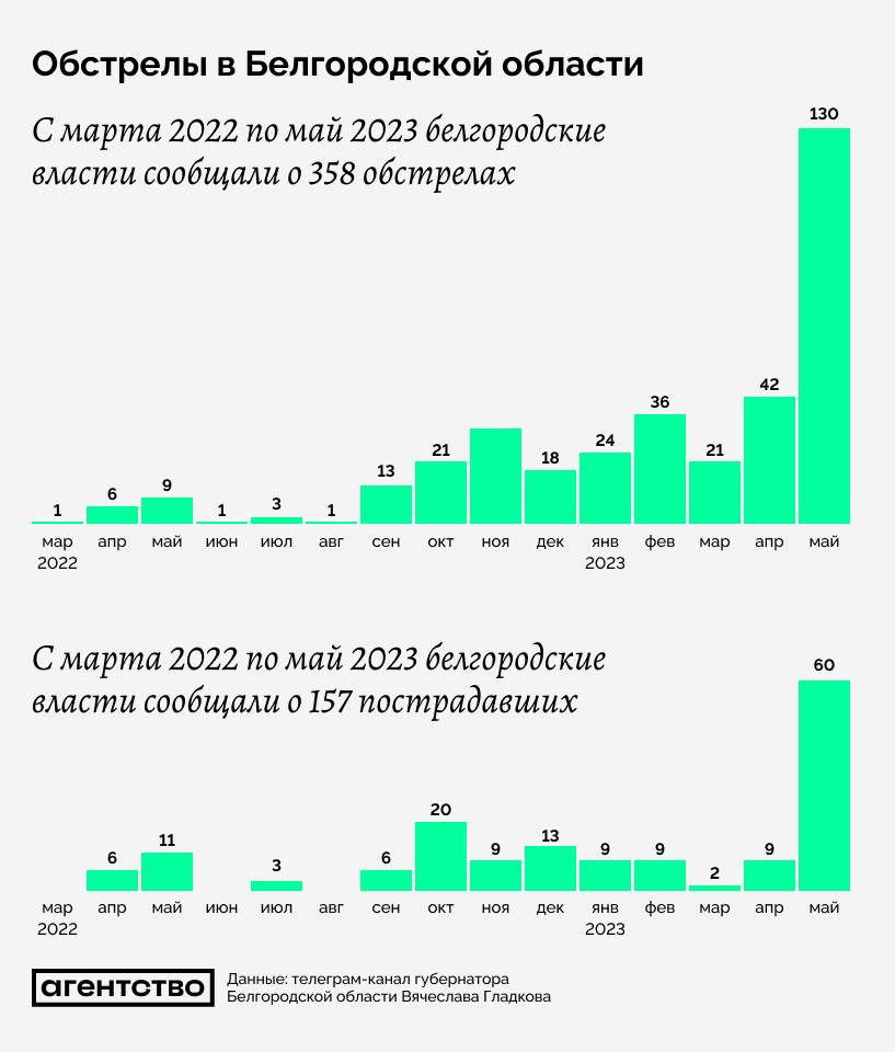 На фоне ожидающегося контрнаступления Украины в мае произошло кратное увеличение числа обстрелов Белгородской области, свидетельствуют расчеты «Агентства». Несмотря на это, власти региона не начали массовую эвакуацию из приграничных районов области и не объявили режим ЧС.
