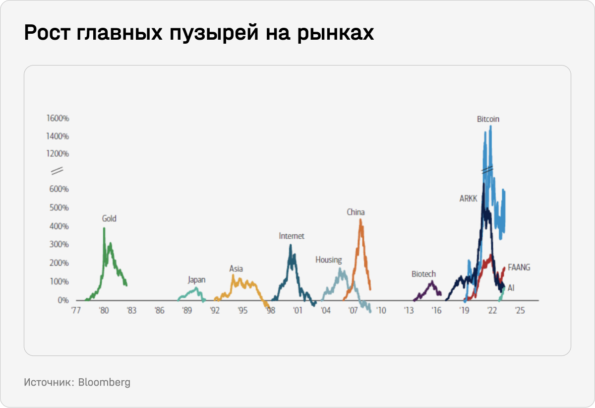 Но несмотря на отдельные истории вроде взлета капитализации Nvidia, по масштабам хайп вокруг ИИ пока даже не приблизился к «пузырю доткомов». В Bank of America текущую ситуацию на рынке даже называют baby bubble (пузырь-малыш). Он также значительно меньше и недавнего взлета биткоина, фондов Ark Invest Кэти Вуд и бигтехов, объединенных аббревиатурой FAANG.