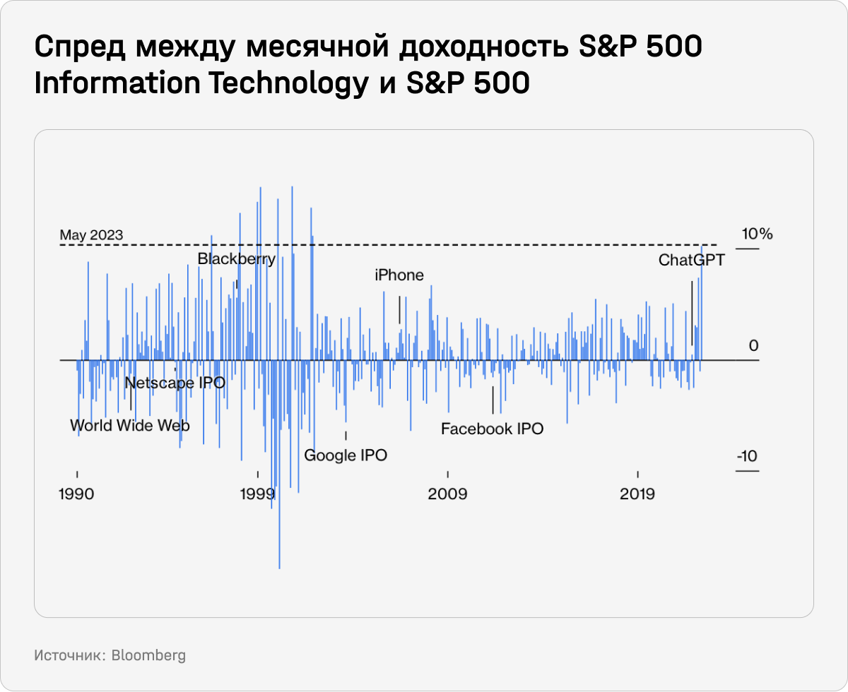 Май стал историческим месяцем для инвесторов в технологические компании: впервые за 20 лет доходность отраслевого индекса S&P 500 обогнала широкий рынок на 10 процентных пунктов. ИИ часто называют «новым iPhone» по масштабу влияния на бизнес компаний, но даже когда Apple выпустила свой первый смартфон, подобной дивергенции не наблюдалось. И это при том, что доля IT-сектора в весе индекса за прошедшие годы сильно выросла, что делает для него опережение рынка более сложной задачей.