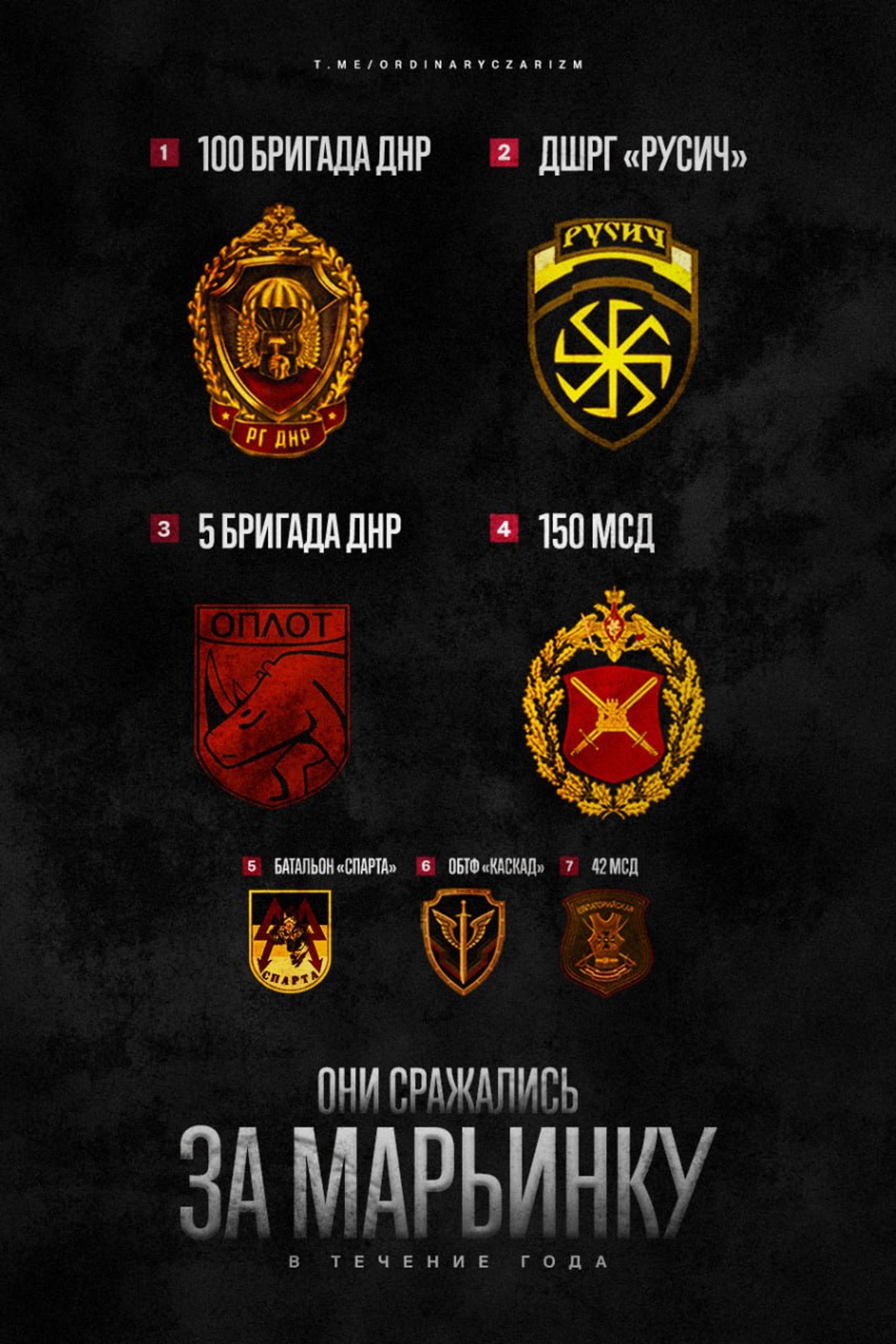 Telegram-канал «Обыкновенный царизм» опубликовал список подразделений, которые уже год захватывают Марьинку. Там упомянуты 100-я бригада «ДНР», 150-я мотострелковая дивизия, 5-я бригада «ДНР», а также батальон «Спарта», ОБТФ «Каскад», ДШРГ «Русич» и 42-я мотострелковая дивизия. Представители «Русича» особо выделяют заслуги 150-й МСД за взятие центра города. Кадры танков этой дивизии в боях за город неоднократно публиковались в Telegram-канале «Танкисты ЮВО».