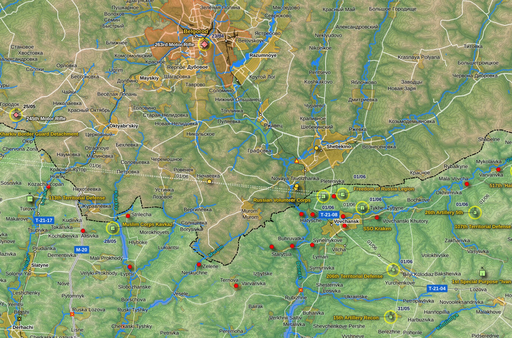 Российские каналы публикуют кадры ударов российских формирований по бойцам «Русского добровольческого корпуса», пытавшимся прорвать границу Белгородской области близ Шебекино. Сообщается о потере РДК двух танков Т-72Б, которые, возможно, ранее участвовали в прорыве у КПП «Грайворон».