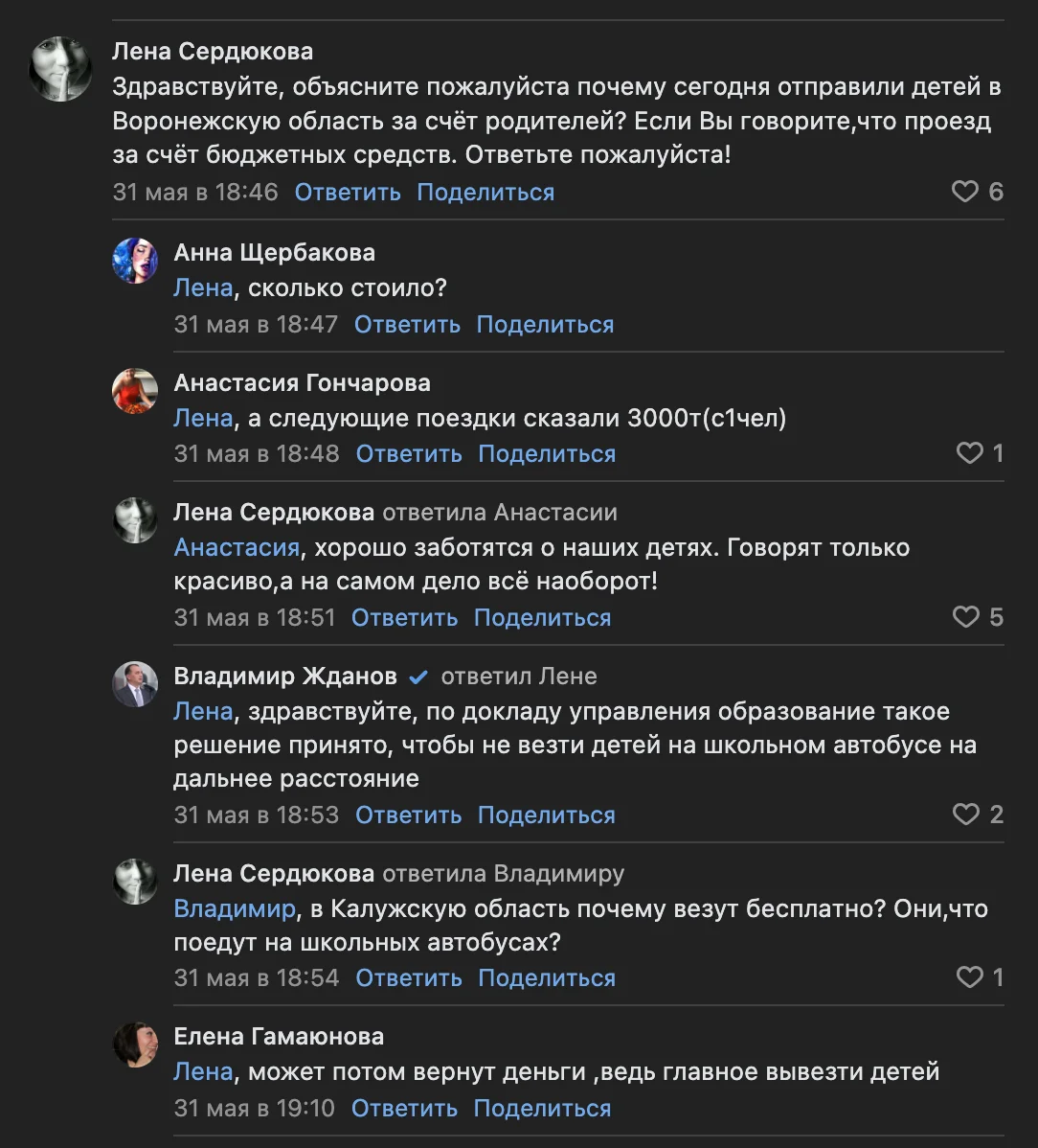 В ответ на один из комментариев Жданов заявил, что «такое решение принято, чтобы не везти детей на школьном автобусе на дальнее расстояние». Однако в разговоре с журналистами он начал отрицать, что с родителей собирают деньги.
