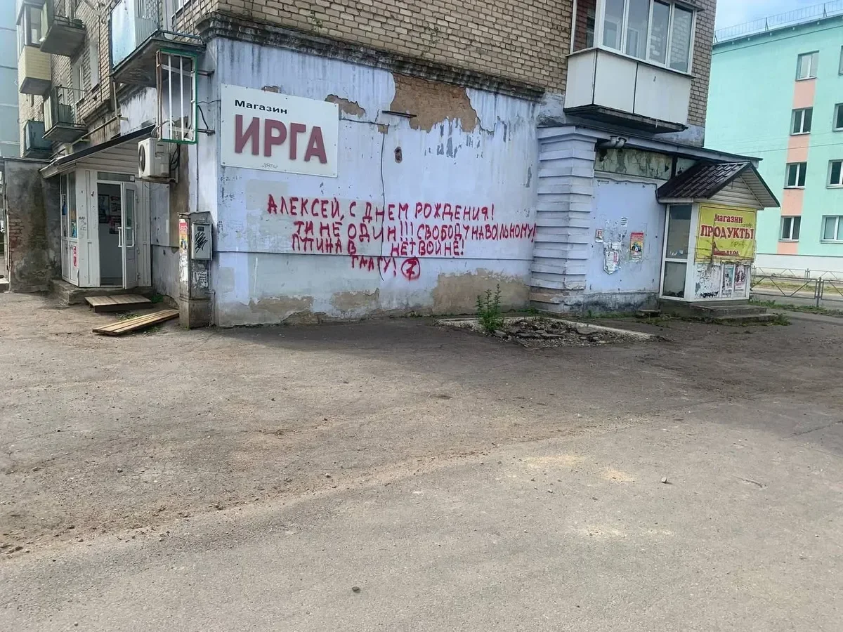 Spray paint writings congratulating Navalny on the occasion of his birthday showed up in Velikie Luki (Pskov region), Strelna (St. Petersburg), Novosibirsk, and Moscow.