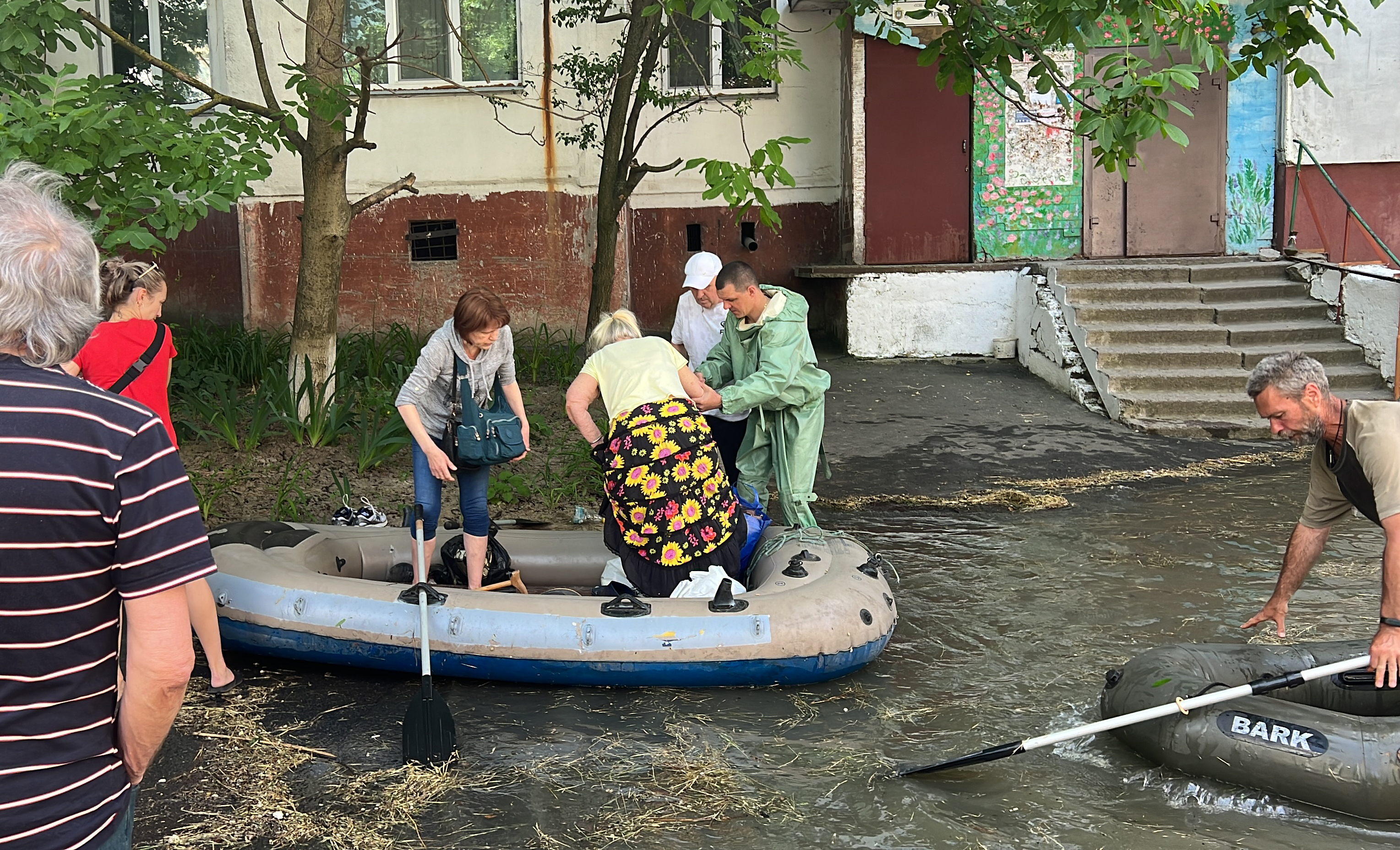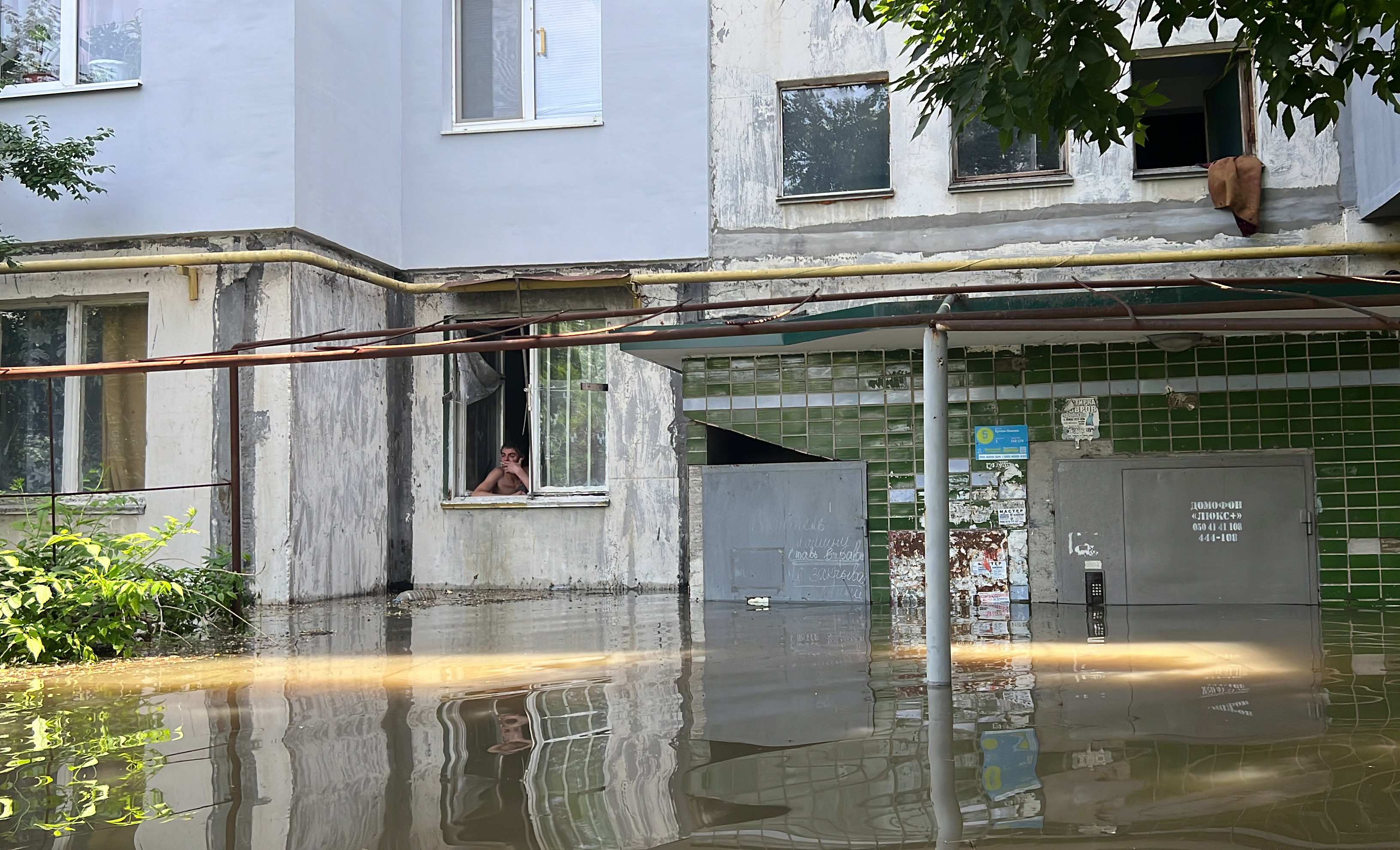 Лодка причаливает у подъезда затопленной девятиэтажки, в котором нужно обойти квартиры. Поднимаемся с Сергеем в подъезд, стучась во все двери. На последнем этаже к нам выходит женщина в домашней рубашке и говорит, что уезжать никуда не будет: «Куда нам уходить — у нас коты, попугаи, дети».