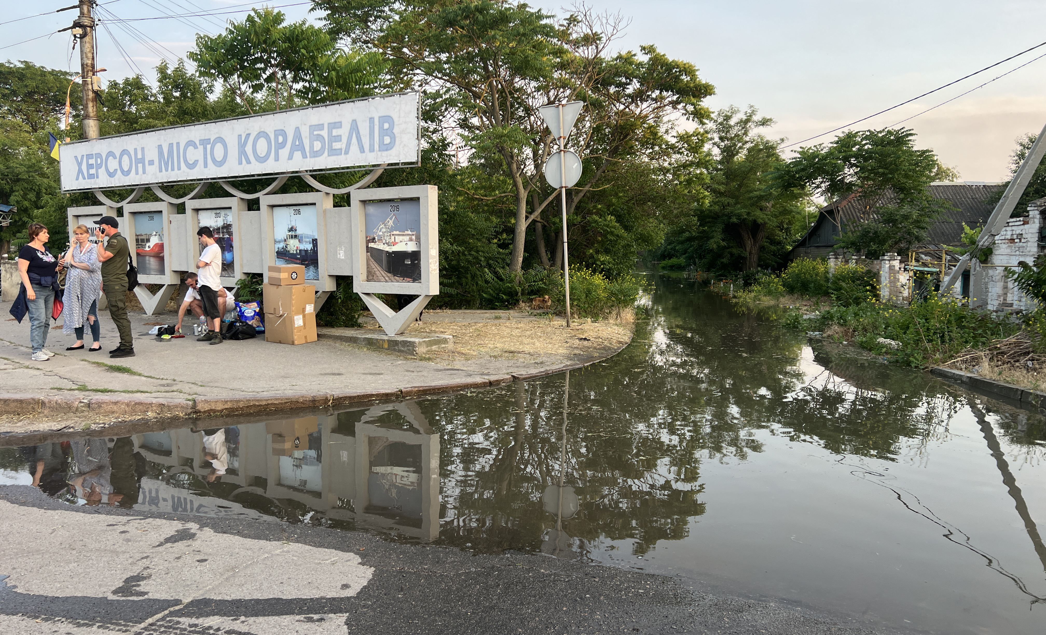 С левого берега, который до сих пор занят российской армией, звучат «выходы» — выстрелы артиллерии. В какой-то момент полицейские резко срываются и уезжают с площади: затопление не отменяет постоянной угрозы прицельного обстрела.