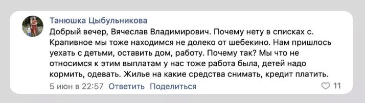 Практически все комментарии под постами губернатора Белгородской области Вячеслава Гладкова во "ВКонтакте" за последнюю неделю посвящены массированным обстрелам Шебекина и окрестностей. После 5 июня значительную часть из них оставляют жители сёл вокруг Шебекинского. В этот день Гладков опубликовал список из 38 сёл, посёлков и хуторов, жители которых могут претендовать на единовременную денежную выплату, кредитные и коммунальные каникулы.