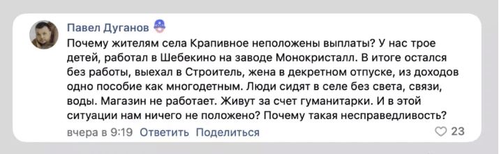 – Почему жителям села Крапивное не положены выплаты? У нас трое детей, работал в Шебекине на заводе "Монокристалл". В итоге остался без работы, выехал в Строитель, жена в декретном отпуске, из доходов одно пособие как многодетным. Люди сидят в селе без света, связи, воды. Магазин не работает. Живут за счет гуманитарки. И в этой ситуации нам ничего не положено? Почему такая несправедливость? – написал беженец из Крапивного Павел Дуганов.