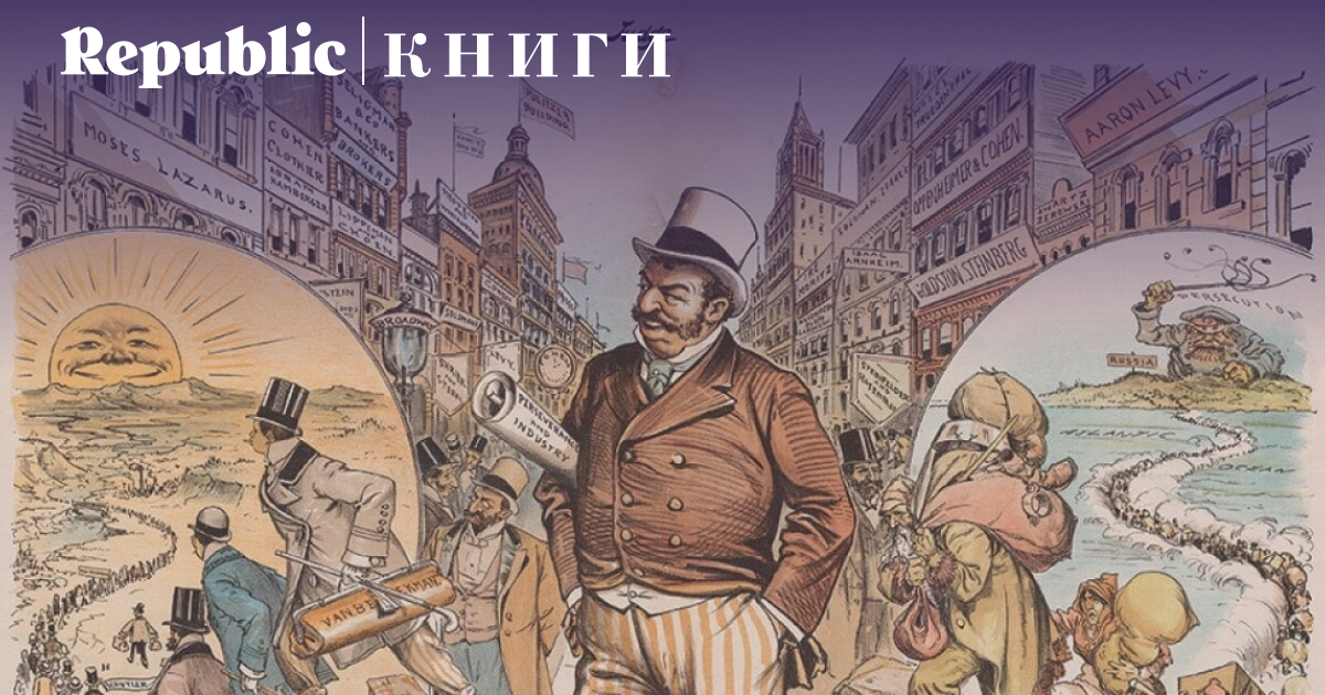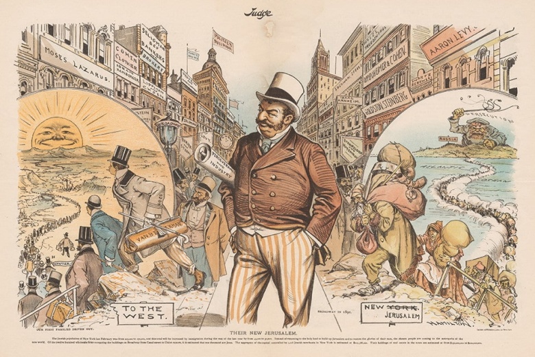 Антисемитская карикатура из нью-йорского журнала Judge, 1892 год. Справа: евреи, спасаясь от притеснений в России (в образе казака с плеткой-шестихвосткой), устремляются в Нью-Йорк, чтобы превратить его в «Новый Иерусалим». На всех вывесках города теперь красуются еврейские имена. Слева: коренные нью-йоркцы, потомки первых жителей города, направляются в западные штаты (на их багаже таблички с английскими и голландскими фамилиями). Подпись гласит: «Наши первые семьи изгнаны».