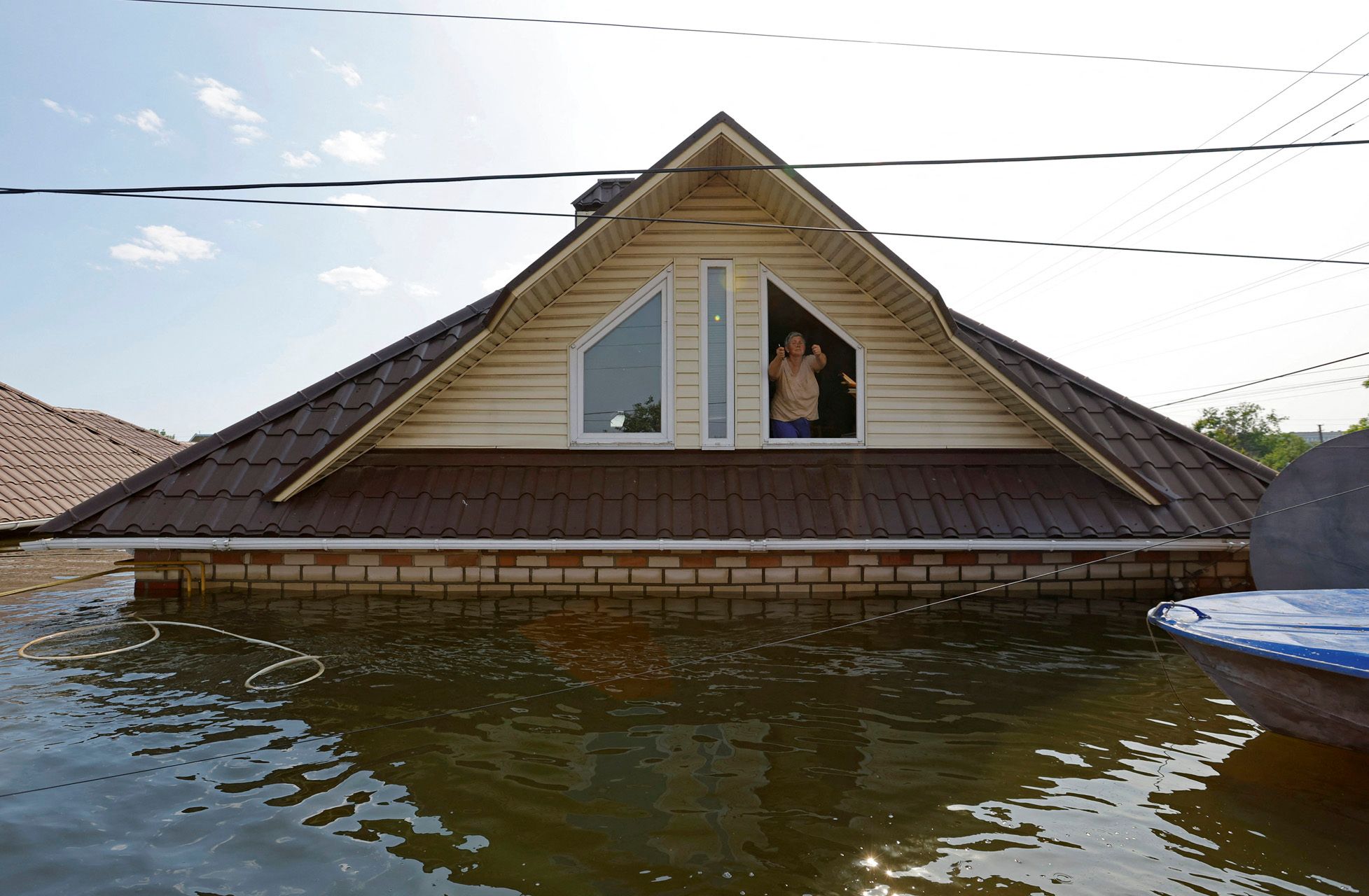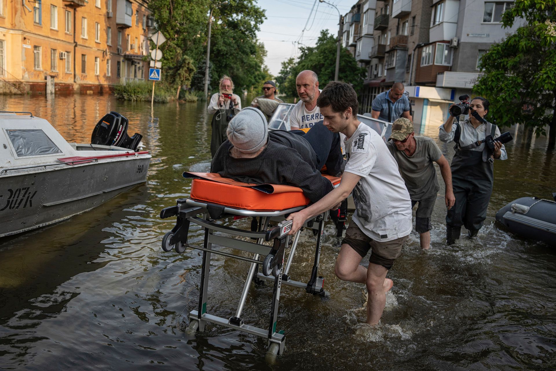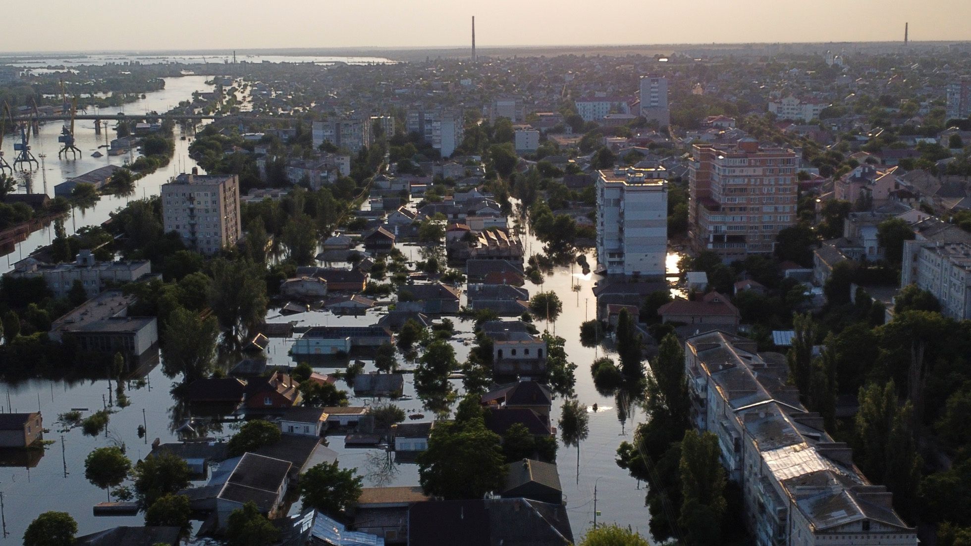 Из-за катастрофы на Каховской ГЭС в том числе частично затоплен Херсон. Сильнее всего пострадали Корабельный и Днепропетровский районы города, в некоторых местах уровень воды достиг третьего этажа. 8 июня в Херсон приехал Владимир Зеленский, в тот же день центр города обстреляли войска РФ — одновременно с этим из затопленных домов Херсона эвакуировали местных жителей. По данным городских властей, ранения в результате обстрелов получили девять человек, в том числе спасатели.