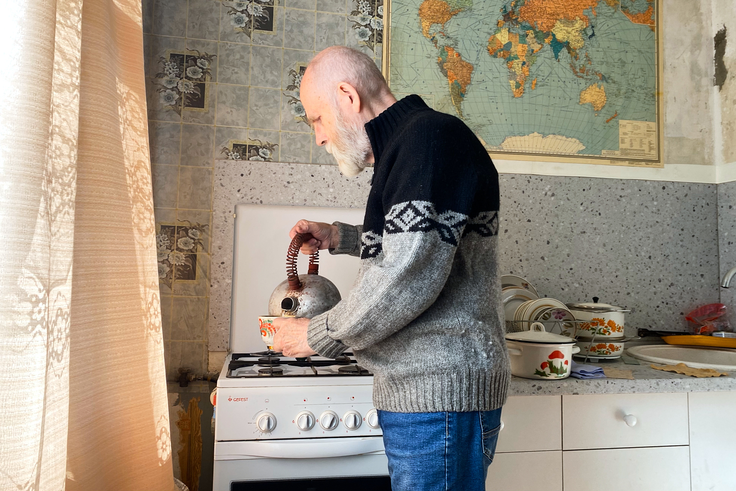 На плите уютной кухни, напоминающей о 80-х, кипит алюминиевый чайник — хозяин говорит, ему дарили электрический, но привыкнуть к нему он не смог.