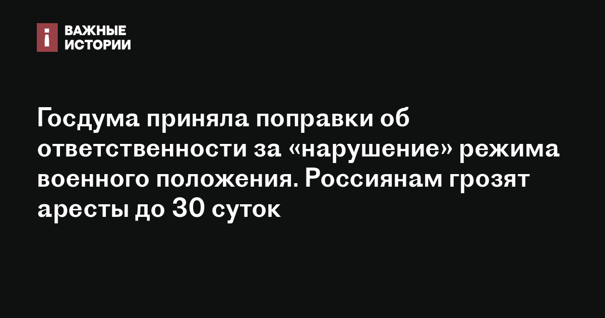 Госдума приняла поправки об ответственности за «нарушение» режима военного положения. Россиянам грозят аресты до 30 суток