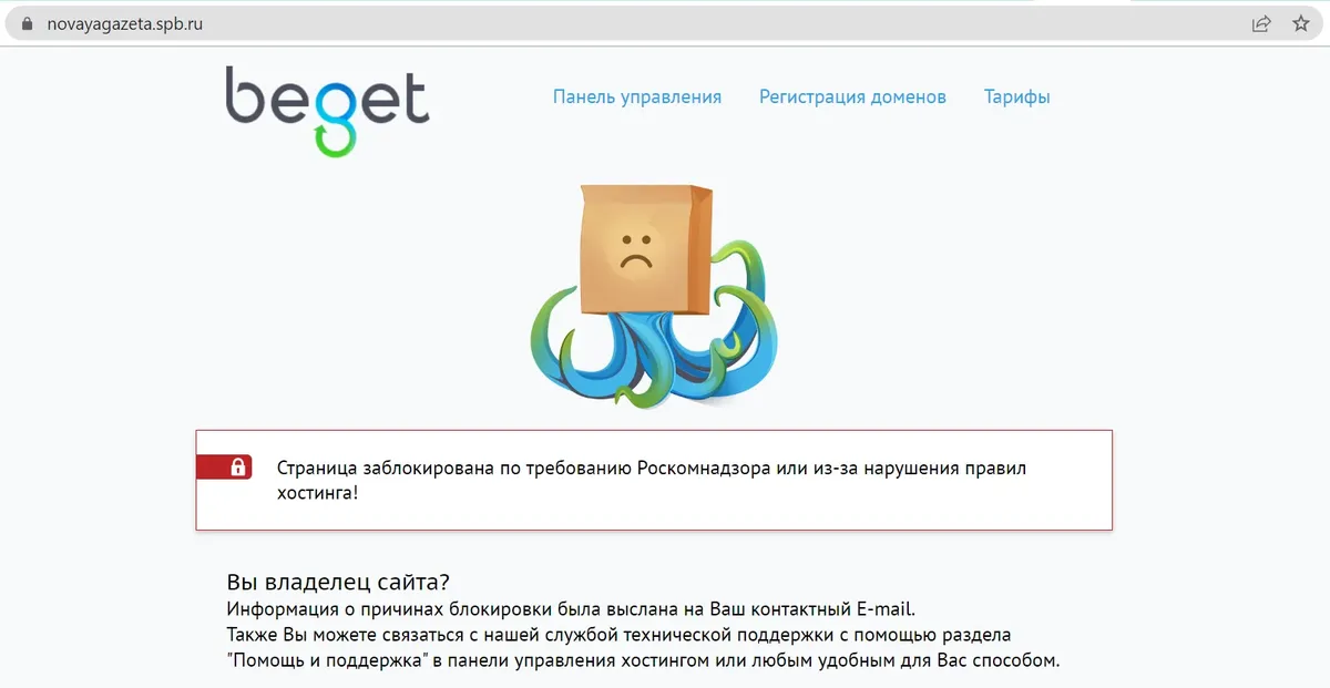 В службе поддержки Beget сообщили Lenizdat, что отключили сайт, так как он находится в реестре Роскомнадзора со статусом «Доступ ограничивается». При этом ведомство не требовало от хостинга отключить сайт петербургской «Новой газеты». Несмотря на это, Beget решили проявить инициативу, так как боятся потерять IP-адрес своего сервиса.