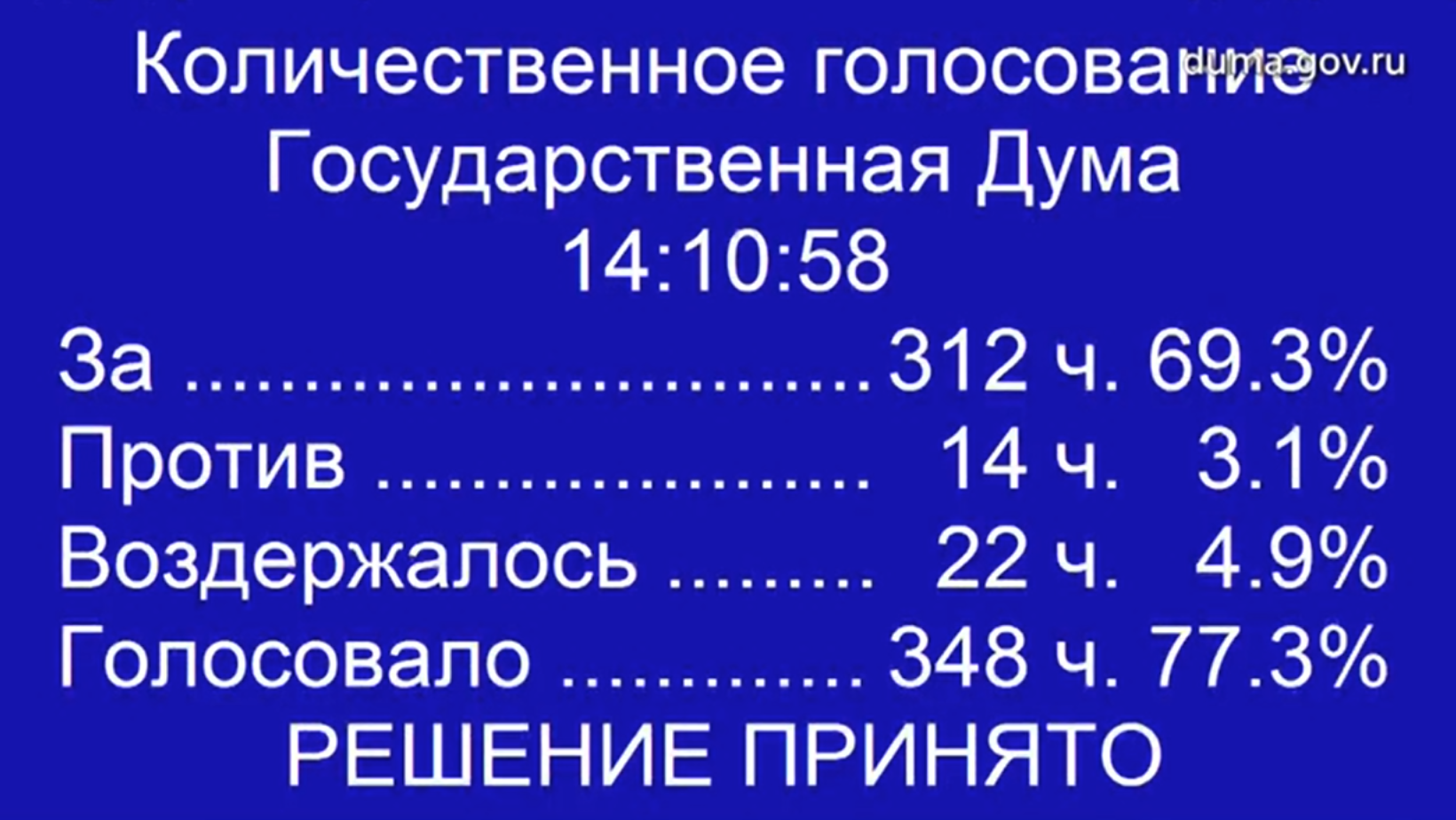 В итоге воздержалось 22 депутата, проголосовало против 14, за — 312.