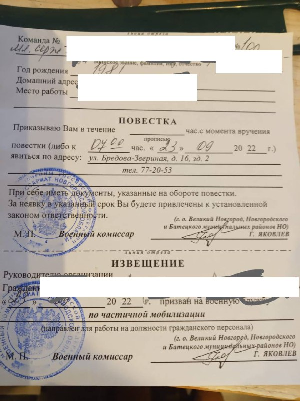 При этом в некоторых регионах, например в Тверской области, Чувашии, Якутии, приказом военного комиссара установлен запрет на выезд за пределы района или города для всех военнообязанных, которые не имеют мобилизационного предписания и повестки.