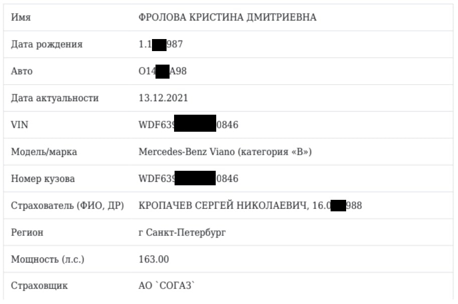 Еще один любопытный факт. По данным из утекших баз, страхователем Mercedes-Benz Viano, который зарегистрирован на Фролову, является Сергей Николаевич Кропачев, родившийся 16 июля 1988 года. Совершенно точно совпадают и ФИО, и год рождения с сыном ректора СПбГУ