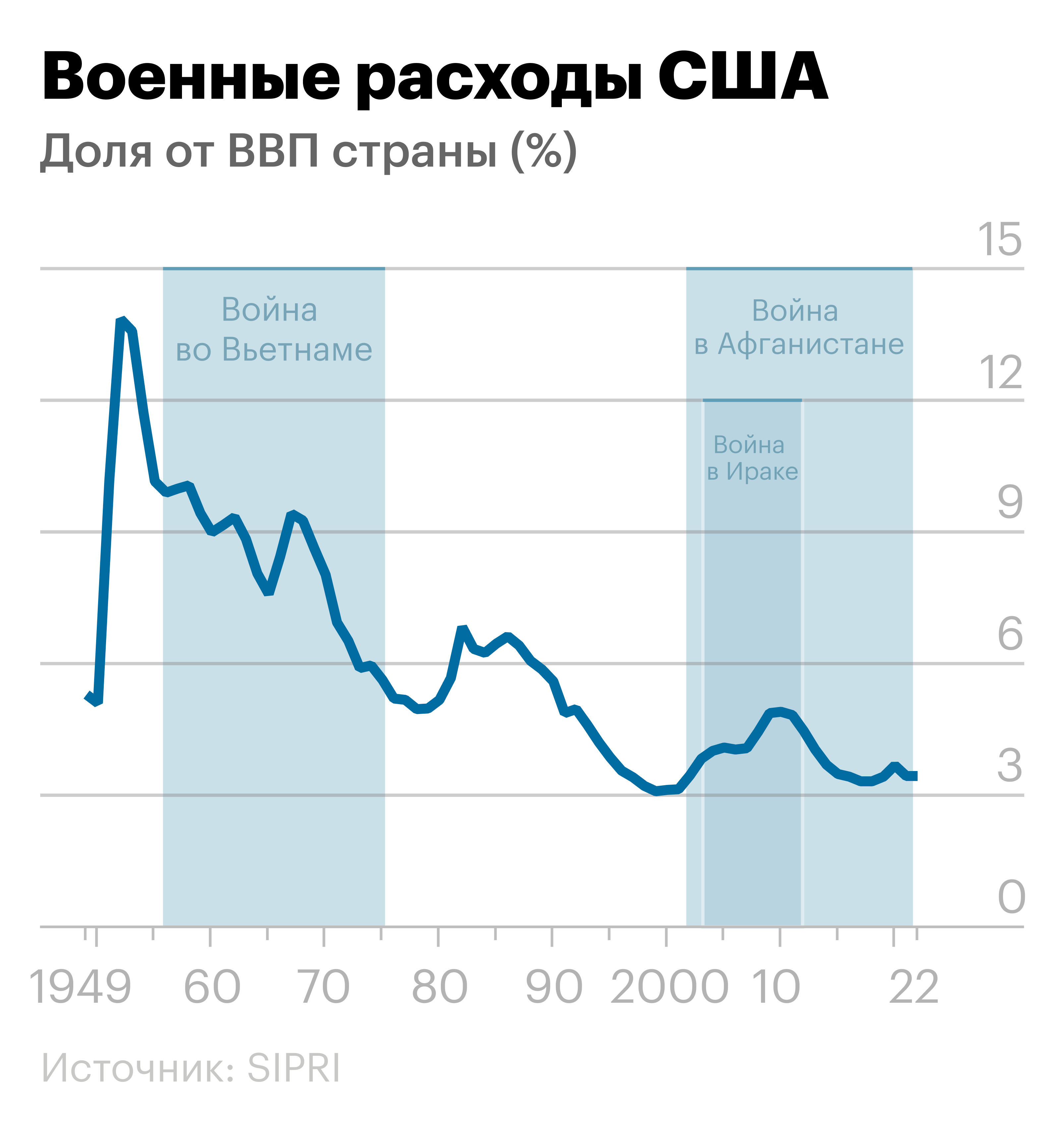 Росту расходов может способствовать целый ряд обстоятельств. Например, эскалация конфликта — и тем более втягивание Америки в боевые действия — приведет к взлету военных трат. Именно с этим имел дело президент Гарри Труман во время Корейской войны. Но даже не втягиваясь в конфликт, американские власти могут принять решение о наращивании военной мощи страны. Многие считают, что огромные траты на оборонку в президентство Рейгана сыграли решающую роль в банкротстве Советского Союза и победе США в холодной войне.