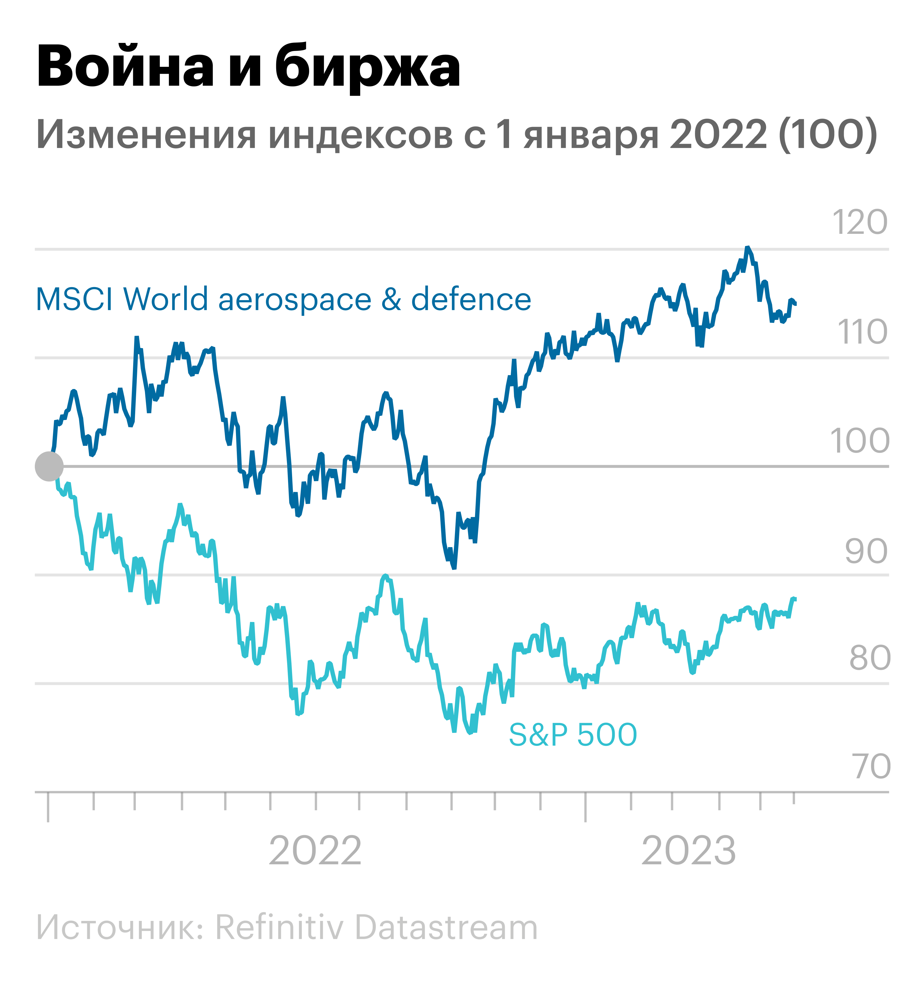 График 3. Биржевой индекс аэрокосмических и оборонных предприятий MSCI в сравнении с индексом S&P 500, учитывающим самые большие по капитализации компании, которые торгуются на американских биржах