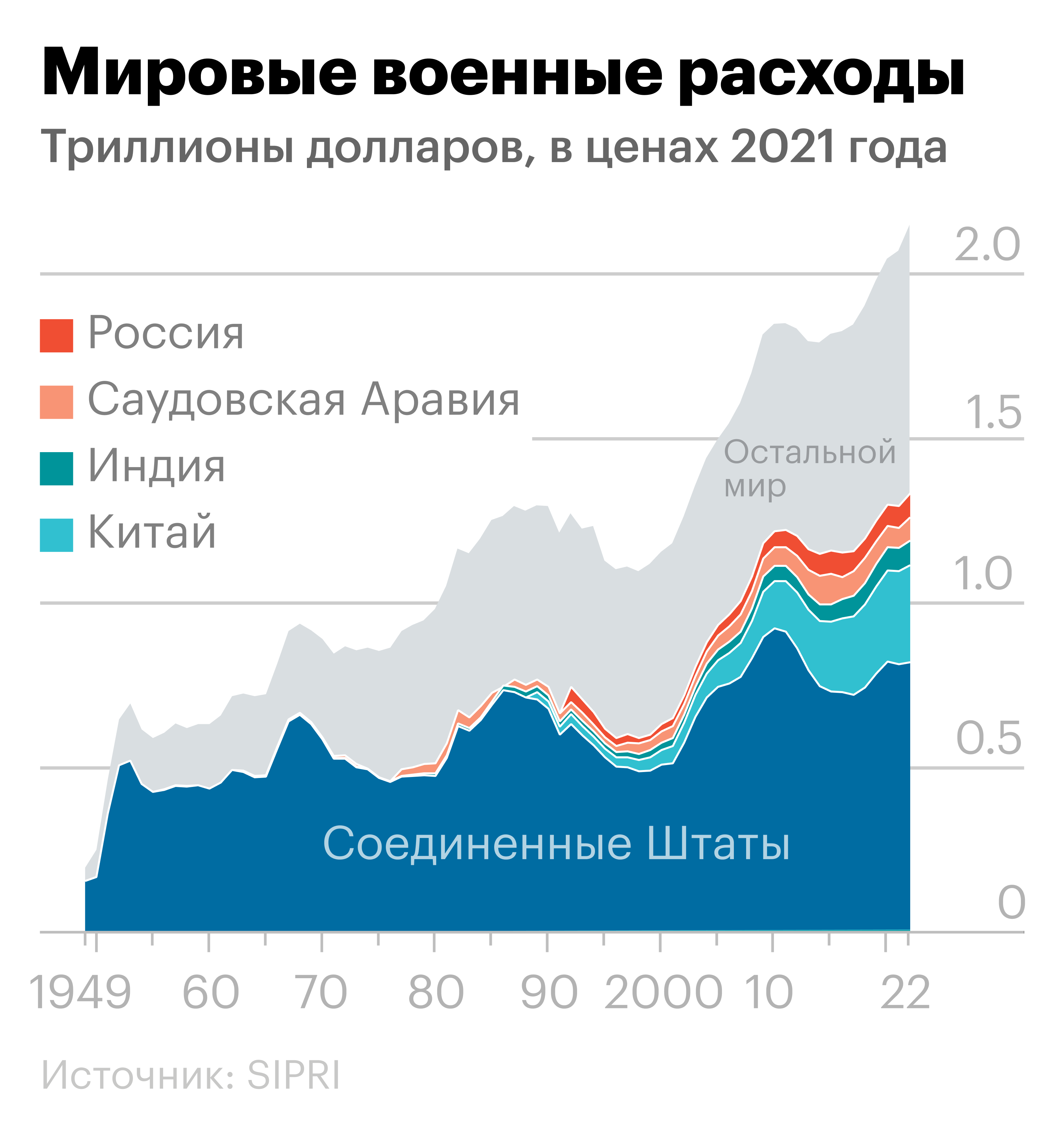 После окончания холодной войны считалось, что сокращение военных расходов позволяет тратить больше на инфраструктуру и государственные услуги, снижать госдолг или налоги. С 1960-х в пересчете на сегодняшние цены на эти расходы было «высвобождено» порядка $4 трлн в год, что сопоставимо с общими тратами всех государств мира на образование. Теперь же «дивиденды от мира» превращаются в «налог на войну». Насколько он будет велик?