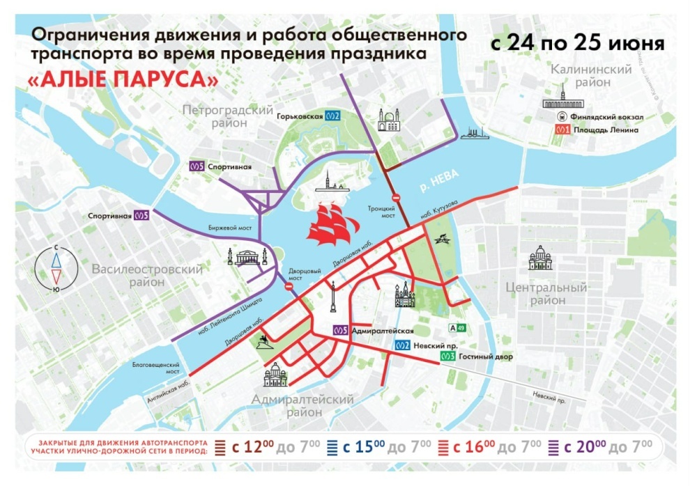 Из-за праздника также будет недоступна автомобилистам часть других центральных улиц. С 12:00 24 июня до 07:00 25 июня будут закрыты Каменноостровский проспект (от улицы Куйбышева до Троицкого моста), Петровская набережная (от Каменноостровского проспекта до проезда по Троицкой площади Петроградской стороны).