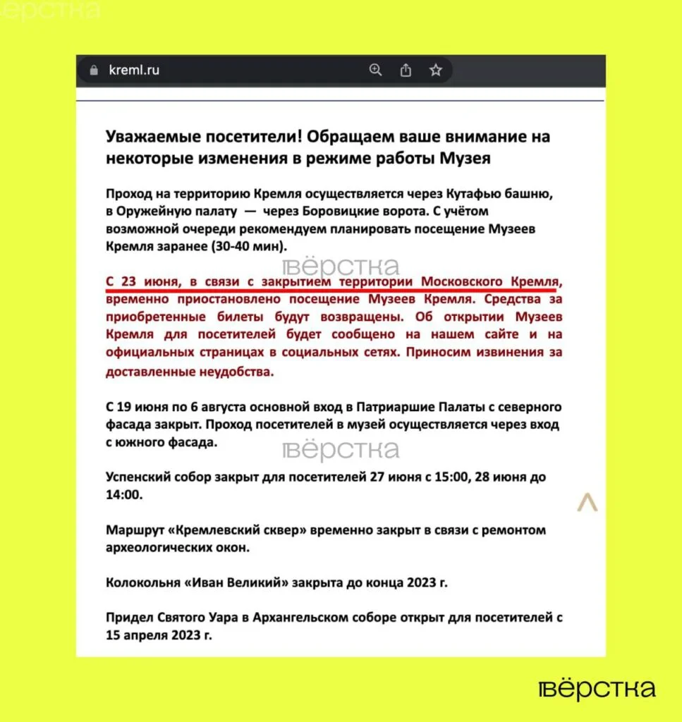 «C 23 июня, в связи с закрытием территории Московского Кремля, временно приостановлено посещение Музеев Кремля. Средства за приобретенные билеты будут возвращены. Об открытии Музеев Кремля для посетителей будет сообщено на нашем сайте и на официальных страницах в социальных сетях. Приносим извинения за доставленные неудобства», — говорится в сообщении.