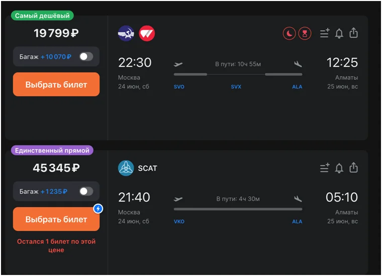В Алматы сейчас можно улететь с одной пересадкой за 19 тысяч (без багажа). Прямой рейс обойдется в 45 тысяч, да и на него остался лишь 1 билет.