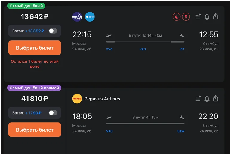 Полеты в Стамбул тоже не дешевые. А те, что есть — раскупают (остаются считанные билеты). Рейс с одной пересадкой обойдется в 13 тысяч рублей без багажа (остался один билет на сегодня). Самый дешевый прямой рейс стоит 41 тысячу. А «Победа» обещает отвезти прямым рейсов в столицу Турции за 91 тысячу. Остался один билет.