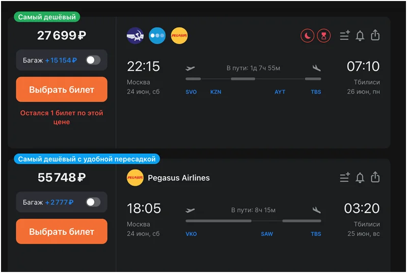 57 тысяч — за билет в Ереван, 55 — в Тбилиси и 100 тысяч на прямой рейс «Победы» до Стамбула
