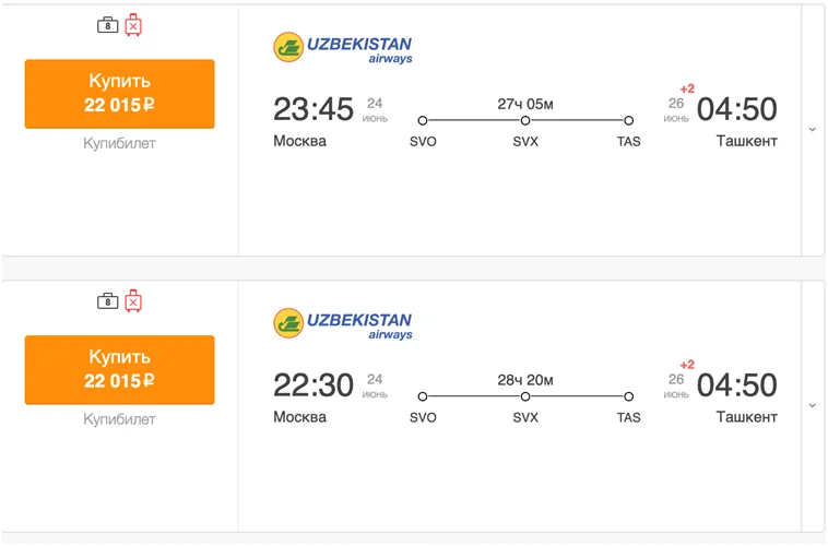 Можно улететь в столицу Узбекистана Ташкент. Билет обойдется в 22 тысячи рублей с одной пересадкой. На момент подготовки материала большая часть билетов была раскуплена.