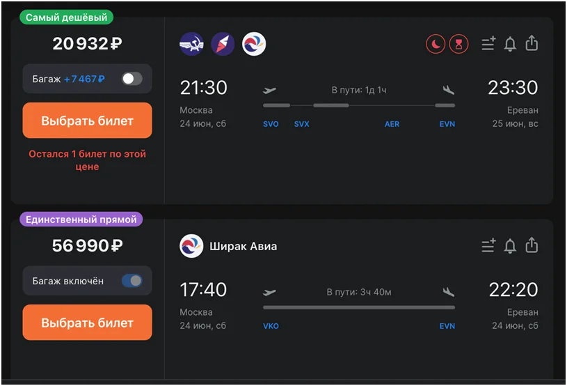 По данным портала «Авиасейлс», по направлению Москва — Ереван цены начинаются от 20 тысяч рублей с двумя пересадками. Единственный прямой рейс стоит почти 57 тысяч рублей. На завтра цены такие же.