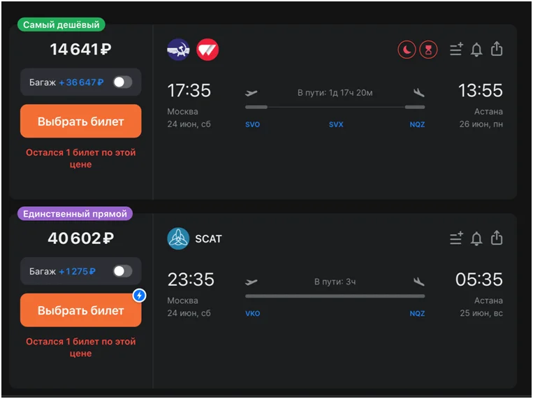 Билетов в Астану тоже почти не осталось — 14 тысяч рублей за самый дешевый рейс с одной пересадкой. Без багажа — за него придется заплатить 36 тысяч. Единственный прямой рейс стоит 40 тысяч. Тоже остался один билет.