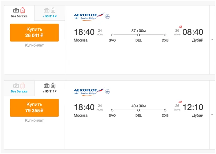 Прямые рейсы до Дубая начинаются от 47 тысяч, согласно порталу покупки билетов «Буруки». С одной пересадкой можно долететь за 26 тысяч, с багажом — за 79. Переплата за багаж — 53 тысячи рублей.