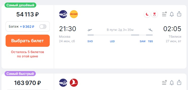 На момент публикации материала самый дешевый билет из Москвы в Тбилиси на 24 июня, по данным Aviasales, стоил 77 тысяч рублей — за перелет с тремя пересадками без багажа. Самый быстрый перелет с двумя пересадками обойдется в 127 тысяч рублей.