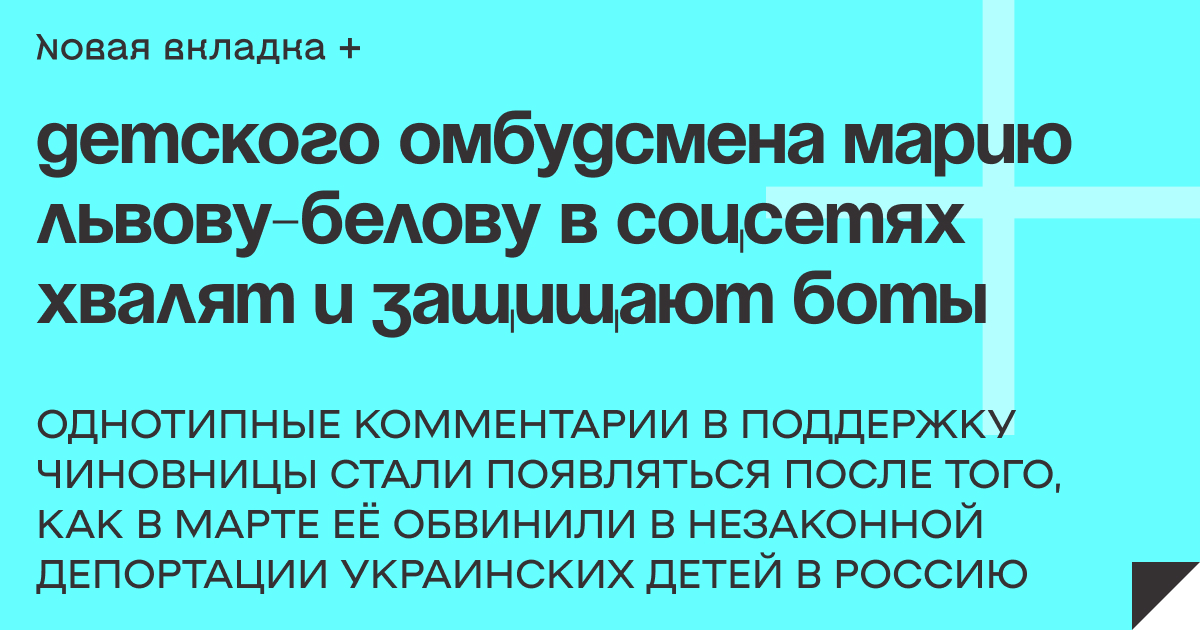 В другом паблике под постом о выдаче ордера на арест Путина и Львовой-Беловой некто Ленкольн Братаев оставил такой комментарий: «О чем вообще идет речь? Откуда столько негатива по отношению к женщине, воспитывающей девятерых детей? Какое такое преступление этот человек совершил, чтобы против него так ополчился белый свет?!» В аккаунте Братаева только одно фото, в подписках у него паблики с мемами, музыкой и популярными цитатами, а самый первый пост на его странице был опубликован 13 июня. Другой комментарий под постом принадлежит некой Тамаре Платоновой: «С каких пор у нас обвиняют людей, которые несут добро в этот мир? Благодаря Марии дети-сироты и колясочники имеют шанс на полноценную жизнь, а ее арестовать хотят, идиотизм, не иначе». В подписках у Тамары — паблики про моду, а на стене — репосты смешных видео про животных и мемы.