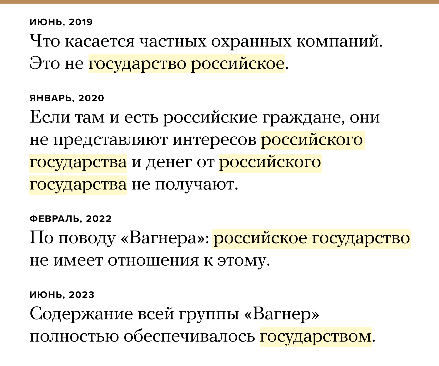 Президент России Владимир Путин 27 июня признал, что государство «полностью обеспечивало содержание» ЧВК Вагнера как минимум с мая 2022 года — и потратило на эти цели не меньше 86 миллиардов рублей. До этого Путин годамиотрицалсвязь ЧВК Вагнера с государством — в частности когда комментировал деятельность наемников на Ближнем Востоке и в Африке.