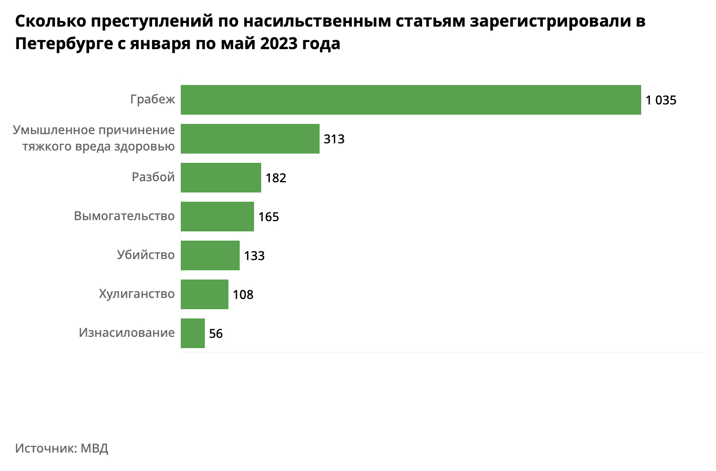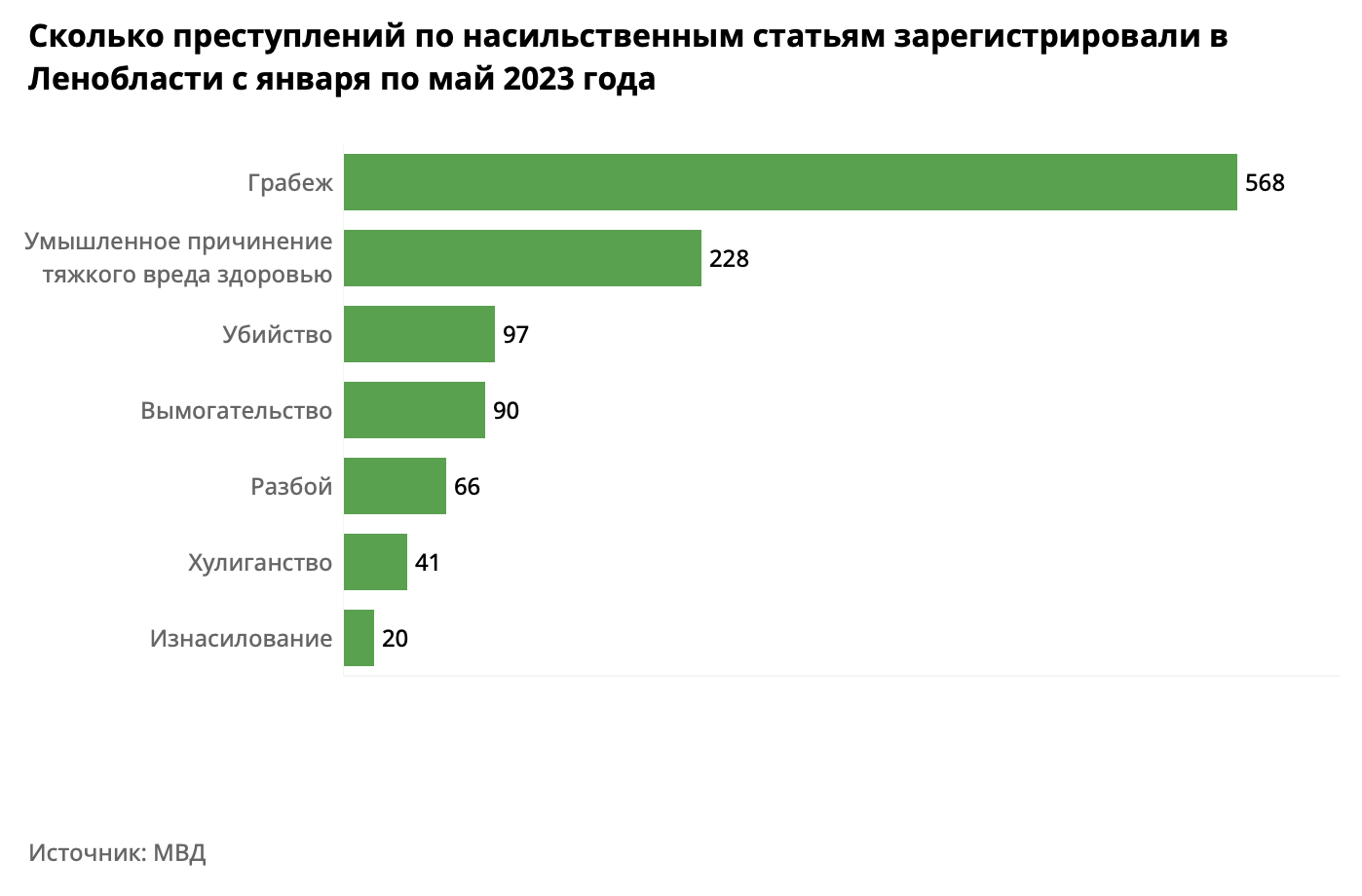 Среди других частых преступлений, связанных с насилием, МВД зафиксировало умышленное причинение тяжкого вреда здоровью, разбой, вымогательство и убийства в Петербурге. В то же время в Ленобласти убийства и вымогательства регистрируют чаще, чем разбой.
