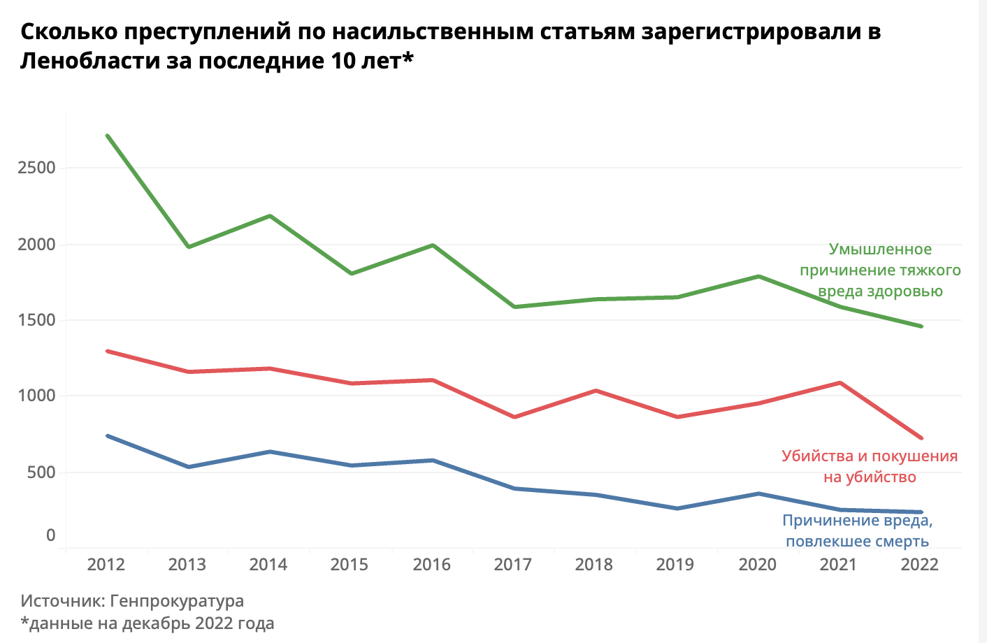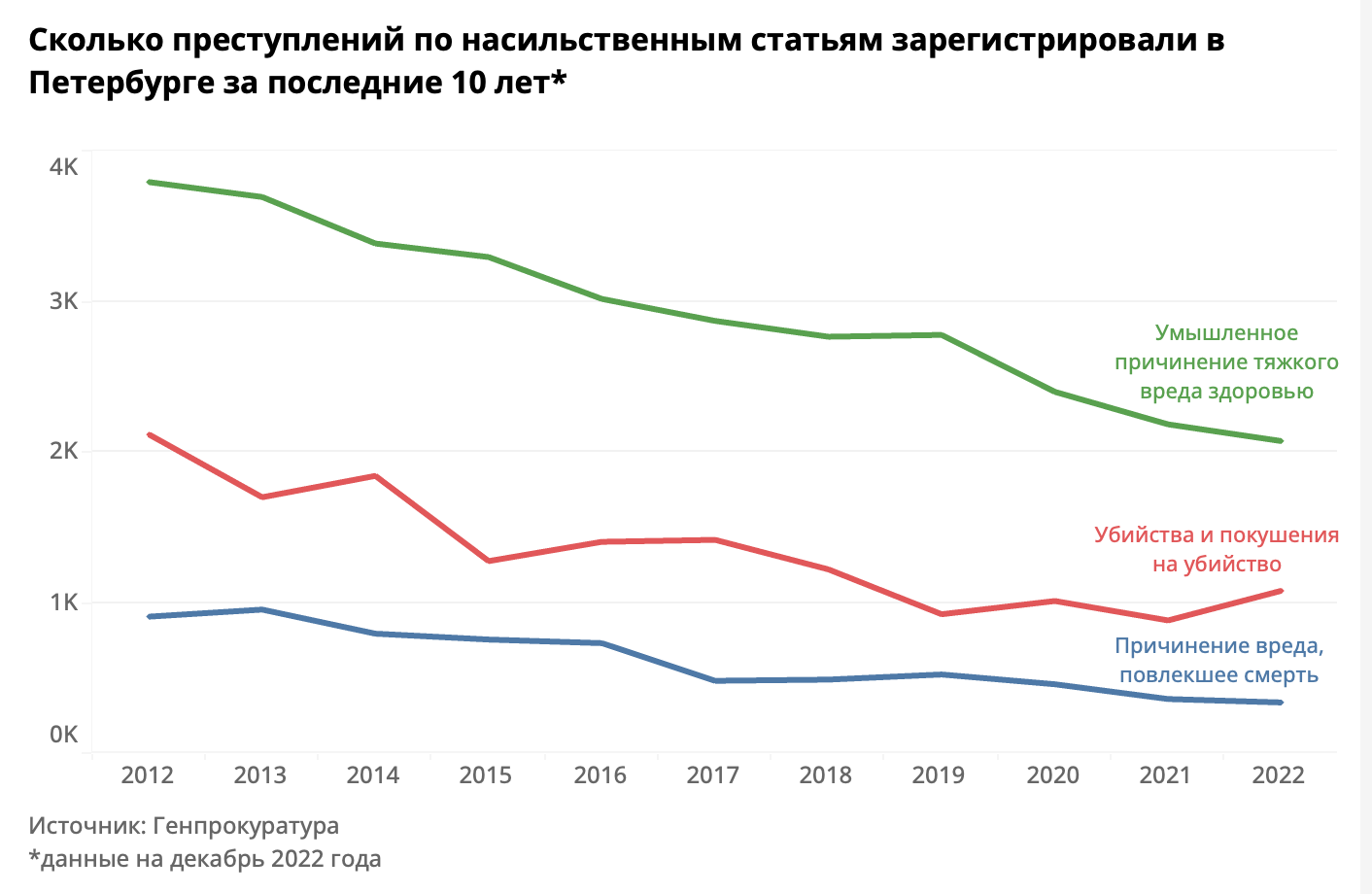 Согласно статистике Генпрокуратуры, в 2022 году общее количество преступлений по насильственным статьям в Петербурге и Ленинградской области, как и в России, снизилось по сравнению с предыдущими годами.