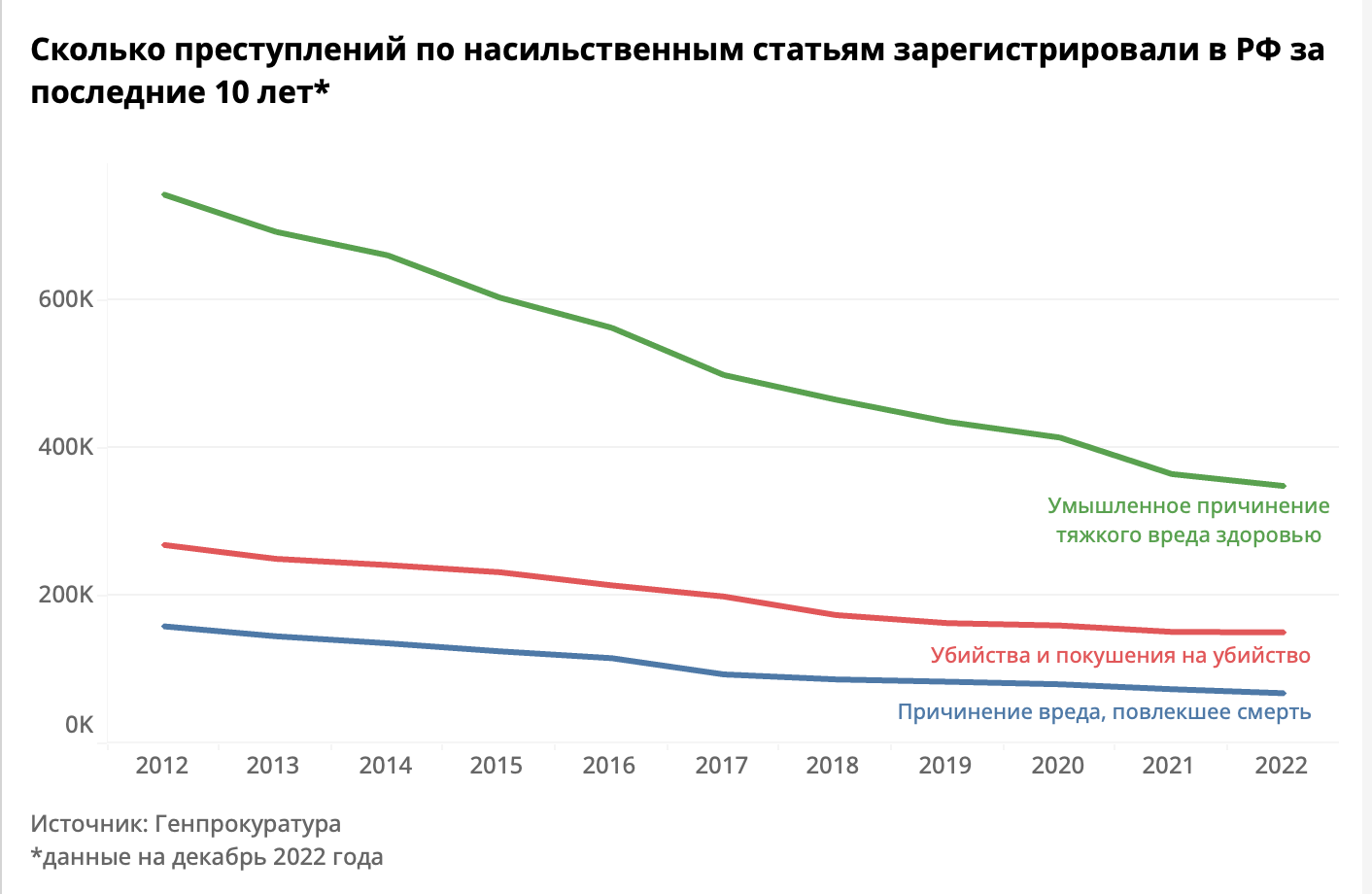 - В 2022 году число преступлений, предполагающих умышленное причинение тяжкого вреда здоровью (ст. 111 УК РФ), снизилось на 4,4 %. Если в 2021 году в статистику Генпрокуратуры попали 363,89 тысячи подобных дел, то в 2022-м — 347,75 тысячи. Для сравнения: в 2012 году ведомство зарегистрировало 741,56 тысячи преступлений по этой статье.