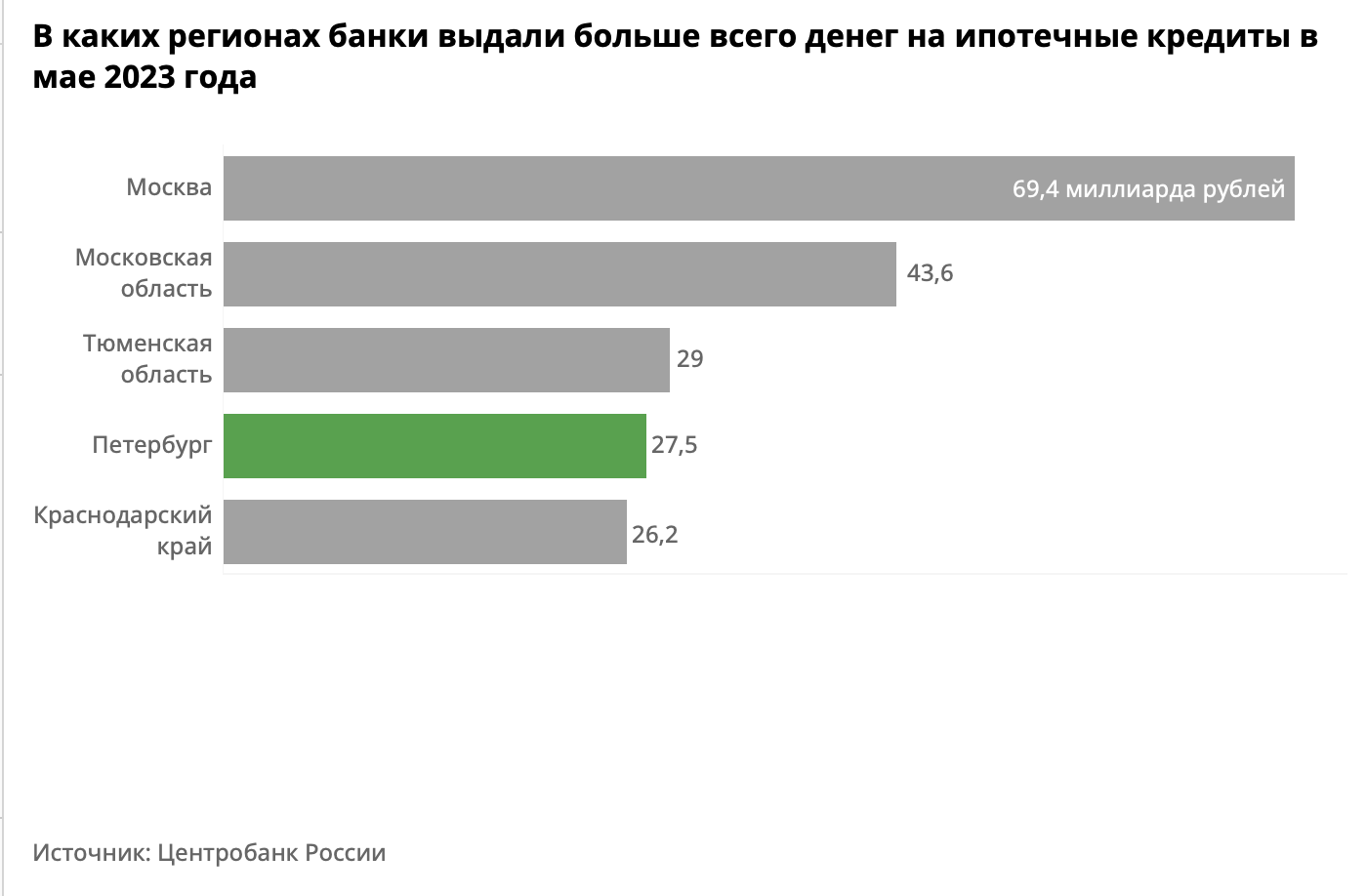 В Петербурге сумма оформленный ипотечных кредитов достигла 27,5 миллиарда рублей. Больше оформили в Москве (69,4 миллиарда рублей), Московской области (43,6 миллиарда) и Тюменской области (29 миллиардов).
