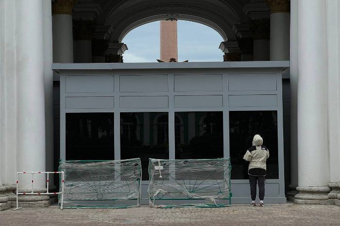 Контекст. В начале июня в арке главных ворот Зимнего дворца установили пункт досмотра. Сооружение заняло центральный пролет арки.