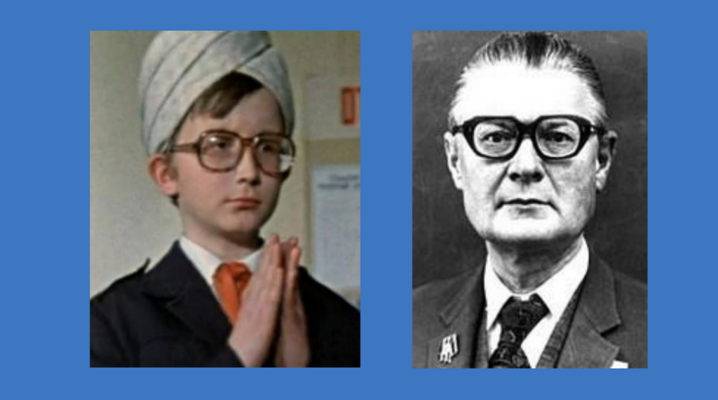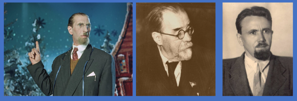 Рядом со скриншотом из фильма вы видите фотографии двух людей. Посередине находится ученый Гавриил Тихов, доказывавший, что жизнь на Марсе есть, — правда, сугубо растительная. Он утверждал, что на красной планете существует полноценная фауна с листьями фиолетового цвета, лучше использующими солнечное тепло. В начале 1950-х, незадолго до выхода «Карнавальной ночи», вокруг гипотезы Тихова (и выросшей из нее науки — астроботаники) велись громкие дискуссии. А на фотографии справа можно увидеть фантаста Александра Казанцева, который не раз обращался к гипотезе Тихова в своих фантастических рассказах. Неясно, специально ли Рязанов сделал профессора в своем фильме похожим на Тихова и Казанцева (возможно, дело просто в том, что так выглядел в то время типичный представитель интеллигенции), но, зная об этом, мы начинаем понимать, насколько тесно могли соприкасаться тогда научные искания и массовая культура.