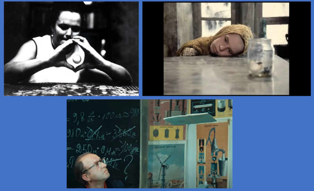 Следующий пример: первым исполнителем телекинеза в советской культуре стала Нинель Кулагина, которую мы уже упоминали выше. Это была женщина из Ленинграда, обретшая известность благодаря демонстрации своих якобы экстрасенсорных способностей. Именно к ее образу отсылает известная сцена из фильма «Сталкер», в которой девочка двигает банку по столу силой мысли. Еще два года назад мы могли только гадать, знал ли Тарковский о существовании Кулагиной или нет, но в начале 2022 года в издательстве «НЛО» вышла книга Евгения Цымбала «Рождение „Сталкера“», которая приоткрывает завесу тайны. В ней приводятся документальные свидетельства того, что режиссер действительно видел записи с сеансом телекинеза в исполнении Кулагиной и после их просмотра сказал: «Теперь я знаю, как будет заканчиваться „Сталкер“».