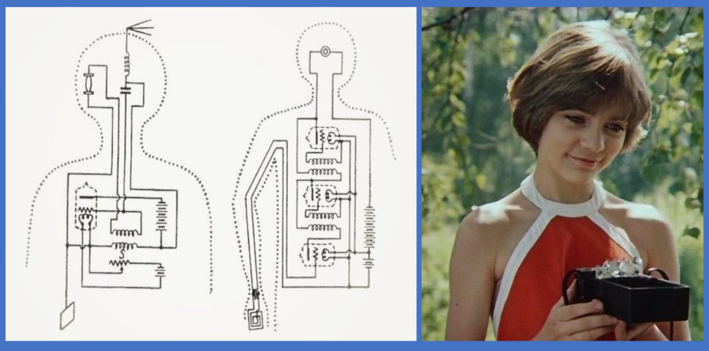 Последний пример связан со знаменитой Алисой Селезневой и ее миелофоном. В 1960-е годы советский инженер и радиотехник Бернард Кажинский выпустил книгу «Биологическая радиосвязь», где доказывалось, что человек внутри устроен как радиоколебательный контур: одни клетки работают как конденсаторы, другие — как катушки-соленоиды. Иными словами, мы можем излучать радиосигналы, а значит, телепатия существует. Сама по себе эта книжка — довольно увлекательное чтиво с интересными картинками: Кажинский описывает в ней память как электрический гистерезис, а шишковидную железу считает приемником радиоволн. Глаза, по мнению автора, излучатели волн, из чего следует, что понятие сглаза имеет под собой реальную основу. Кажинский считал, что перспективы использования телекинеза относятся к сфере педагогики: по его мнению, в ближайшем будущем учителя смогут передавать ученикам информацию непосредственно в мозг с помощью особого прибора «мыслефона». Кир Булычев, как всякий настоящий писатель, был чуток к словам и наверняка следил за дискуссиями о телепатии в советской печати — в миелофоне Алисы Селезневой угадывается «мыслефон» Кажинского.