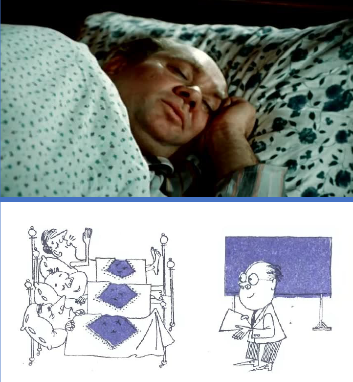 Следующий фильм, к которому мы обратимся, — «Большая перемена» (1972). В нем мужчина, обучающийся в вечерней школе (его играет Евгений Леонов), перед сном включает магнитофон с записью материалов для завтрашнего занятия. Однако из-за того, что его дочка меняет пленку, на следующий день персонаж рассказывает на занятии совсем не то, что ему задали. Может показаться, что это просто выдумка режиссера, но на самом деле в СССР в начале 1970-х была большая шумиха вокруг так называемой гипнопедии. Основное развитие эта идея получила в украинском контексте: в Киеве психологи Леонид Близниченко и Абрам Свядощ организовали целую школу, в которой людям включали на ночь магнитофоны с записями английских слов. По словам ученых, за ночь человеку удавалось выучить двадцать слов. На эту тему велась большая дискуссия, и мы находим ее отражение в кинематографе. Внизу, под скриншотом из фильма, — картинка из научно-популярного журнала, в котором также обсуждалась «гипнопедия».