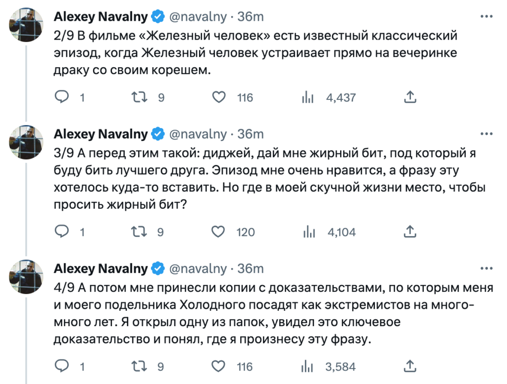 Навальный обратил внимание на приобщенный к делу текст песни на одном из судебных заседаний, процитировав фрагмент фильма «Железный человек».