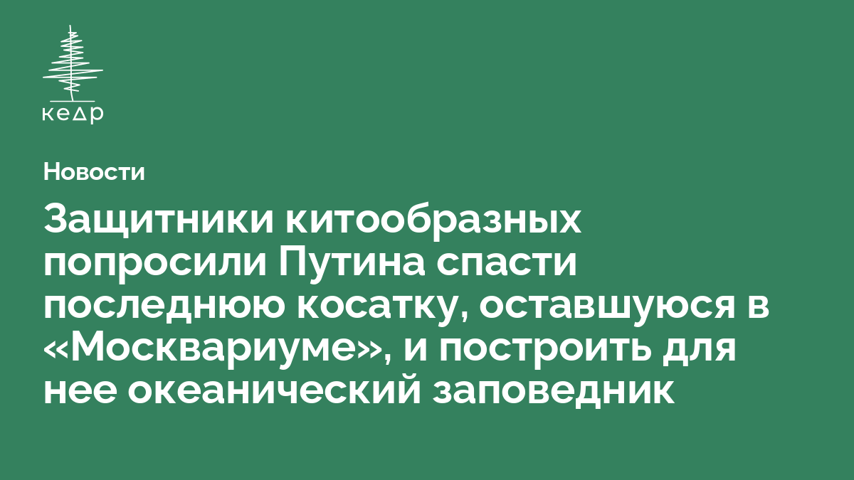 Президента России Владимира Путина попросили построить океанический заповедник для единственной оставшейся в живых косатки в «Москвариуме». Петицию создала организация The Women Of The World United Against Taiji, которая борется за то, чтобы китообразные свободно плавали в океане.
