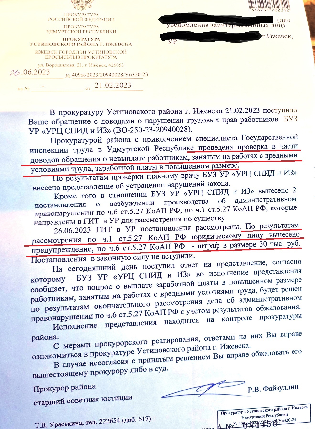 26 июня Государственной инспекцией труда виновное лицо привлечено к штрафу в размере 30 тысяч рублей. Судя по всему, работодатель свою вину в нарушении трудовых прав работников не признает до сих пор. Непонятно, правда, чем аргументированы его действия, неужели даже из-за каких-то несчастных 4 процентов от оклада он готов судиться до последнего, лишь бы не платить. Впрочем, в нищей Удмуртии уже ничему удивляться не приходится. Сразу почему-то вспоминается случай с медсестрами из детского инфекционного отделения при Глазовской МБ, где также были выявлены нарушения трудового законодательства в части отсутствия доплаты за совмещение. Вместо того, чтобы признать свою вину и оплатить какие-то жалкие крохи в размере 3 — 4 — максимум 5 тысяч рублей, работодатели готовы продолжать унижать работников.