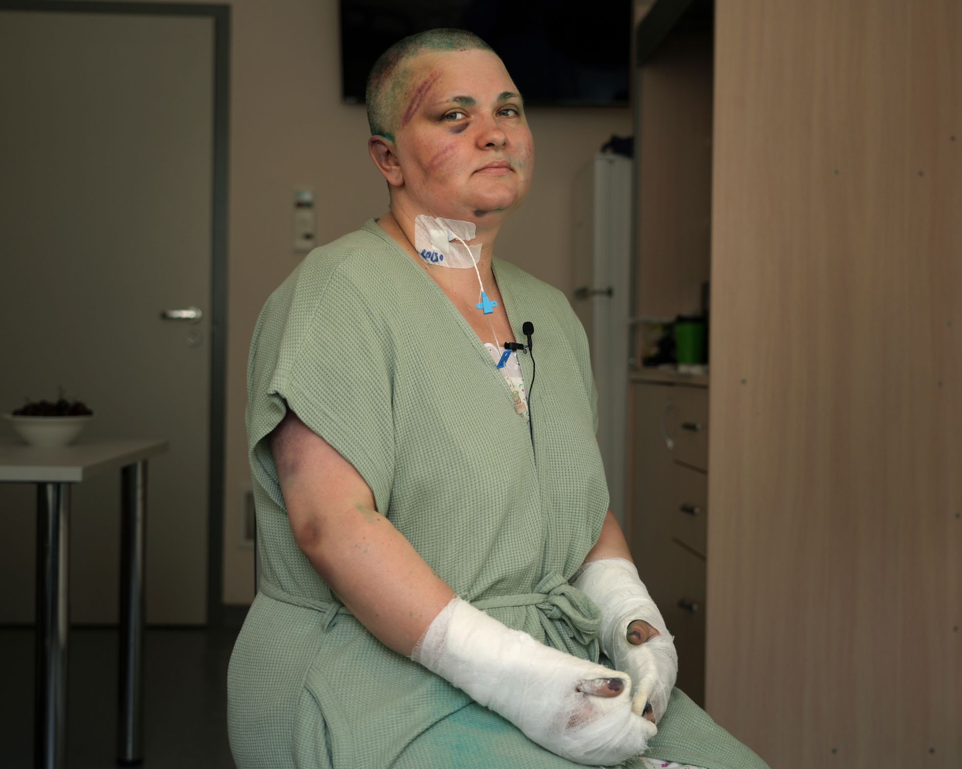 Мы проехали, наверное, метров пятьсот от шлагбаума аэропорта, я пила кофе — и вдруг мы съезжаем на обочину. Я увидела в противоположное окно машину с людьми в черных платках. Ну, знаете, такие платки на лицо, моду на них вагнеровцы ввели. И оказалось, что и с этой стороны тоже машина, и сзади тоже машина — то есть три машины, и все произошло просто вот мгновенно. Нас заставили съехать на обочину, водителя из машины вытащили, к нам засели несколько вот этих вот мужчин и начали нас бить. Наклонили нас так, чтобы головы были ниже колен, в этот же момент, как мы потом поняли, пырнули Сашу в ногу ножом, а мне очень сильно ударили по шее.