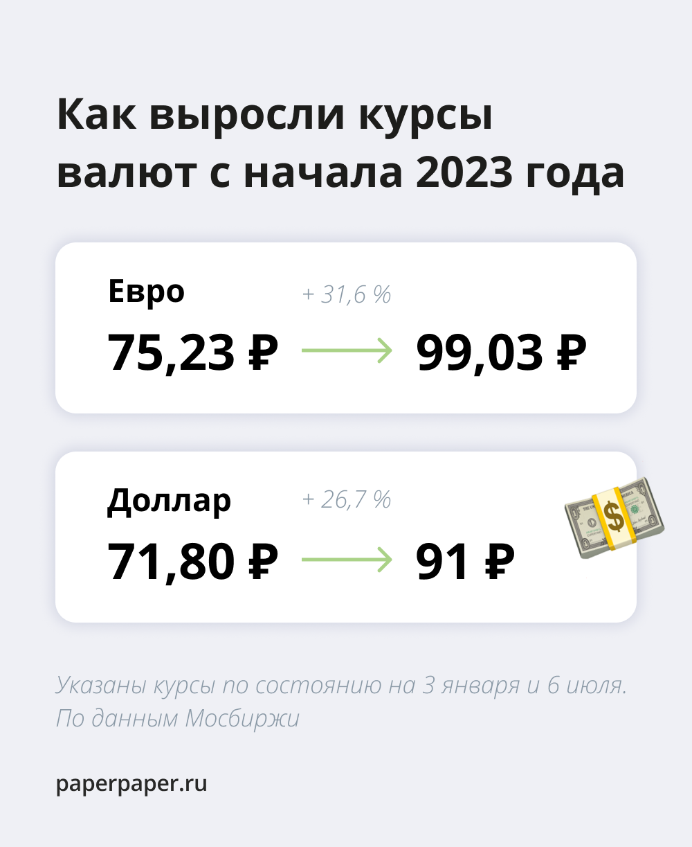 Ослабление рубля к основным зарубежным валютам началось еще прошлой осенью — причины «Бумага» объясняла здесь. В 2023-м этот тренд только усилился, а евро и доллар укреплялись по отношению к рублю на протяжении всего года.